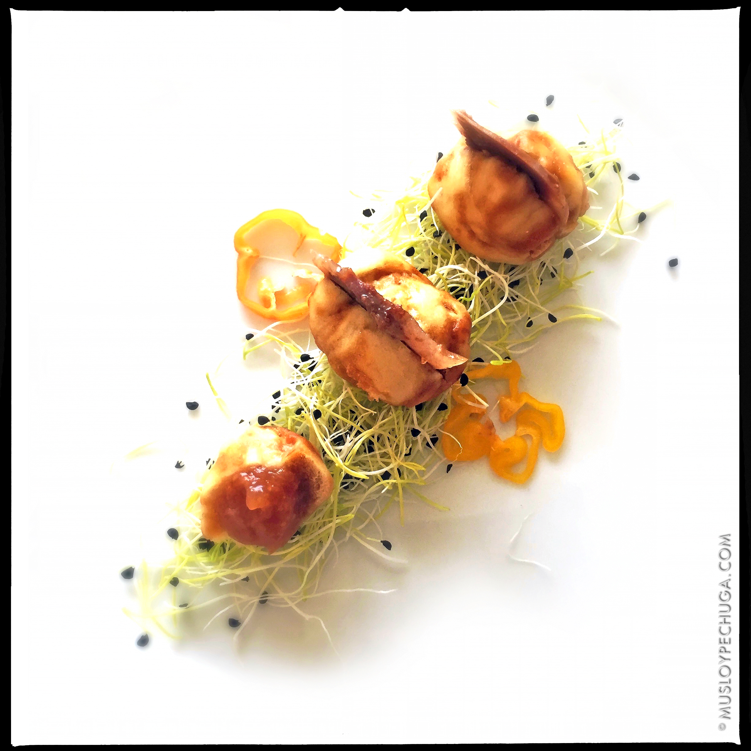 Y ya que nos encontramos en plena campaña del Bonito del Norte –ese pequeño túnido que se pesca manualmente en nuestras costas– vamos a incorporarlo al salmorejo asado con el punto ácido y refrescante que solo un ligero escabeche casero –con aires manchegos– puede conseguir. Un espléndido contraste de acidez, sutileza, diversidad aromática e intensidad.