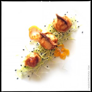 Vamos, también, a modificar el método de cocción del huevo marinando las yemas hasta convertirlas en unas delicadas bolitas cremosas. Para ello, las curaremos manteniéndolas sumergidas en salsa de soja hasta obtener una deliciosa, profunda y untuosa perla anaranjada. Un sabroso, sorprendente y bonito toque para redondear esta propuesta.