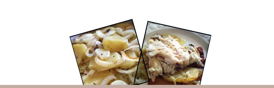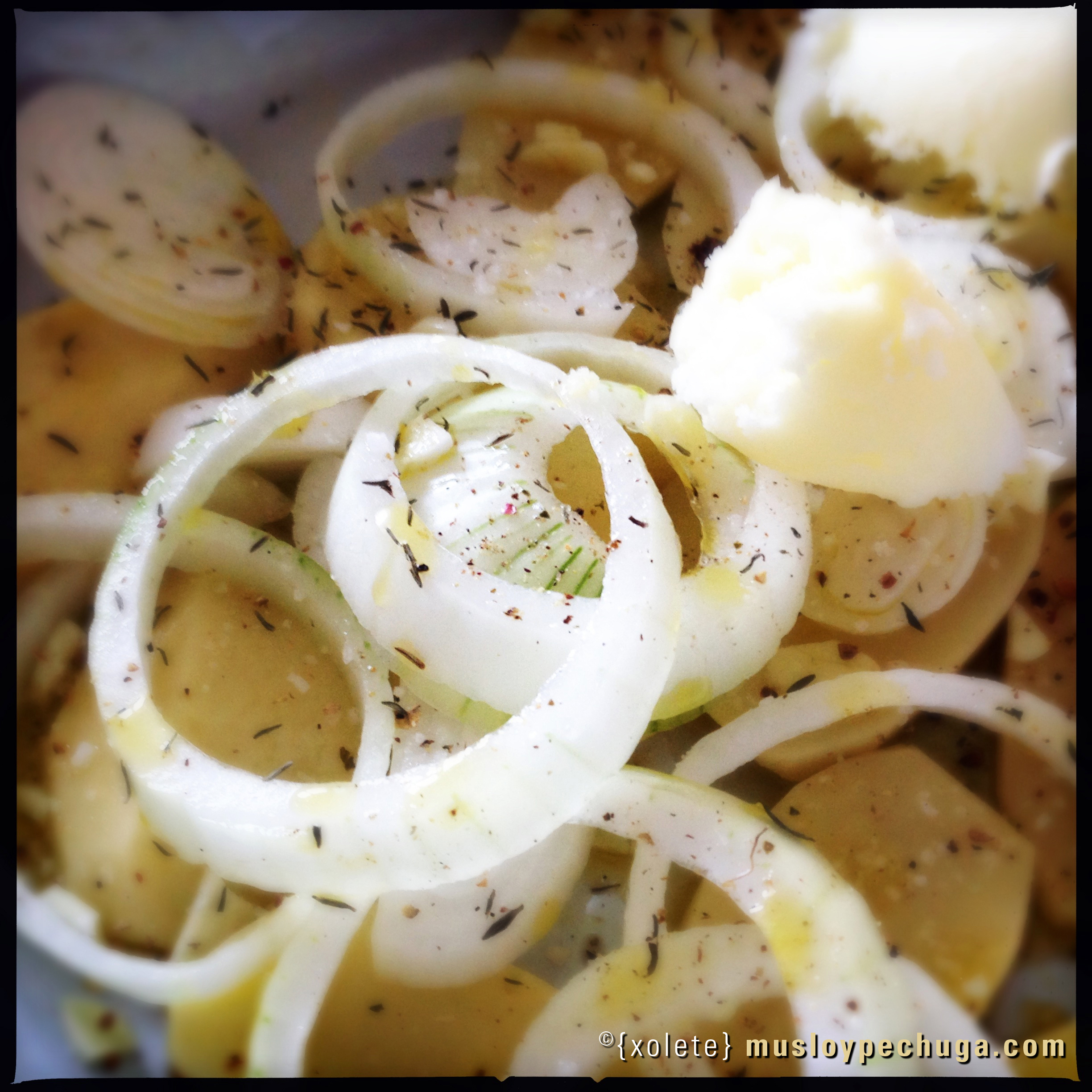 La elaboración es muy sencilla; precalentamos el horno a 180º y, en primer lugar, pelamos y cortamos en lonchas gruesas -como medio centímetro- tanto las patatas como la cebolla. Las pasamos a una fuente de horno donde les incorporamos un chorrito de AOVE, la sal gruesa, una buena molida de pimienta, el tomillo y la cuchara de grasa de pato.