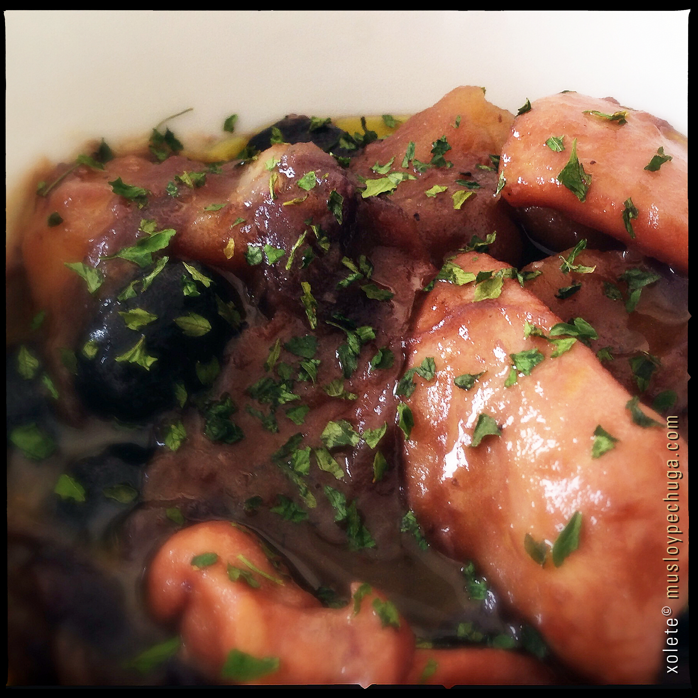 Por último, incorporamos el vino blanco restante, tapamos la cazuela y dejamos cocer suavemente durante unos 25 ó 30 minutos, hasta que las patatas estén hechas y el vino se haya transformado en una melosa e intensa salsa oscura. Comprobamos el punto de sal y, antes de servir, retiramos la ramita de romero, espolvoreamos con el perejil recién picado y dejamos reposar durante unos 5 minutos a fin de que los aromas y sabores se estabilicen. Para acompañar a este intenso y aromático guiso mi sugerencia es un buen vino blanco frutal -o floral- que aporte la ligereza y aromas refrescantes que nos harán disfrutar plenamente de este festín para los sentidos -un Corbières, vino blanco del Languedoc-Roussillon, puede ser una excelente elección-. Que ustedes lo disfruten y… Bon appètit!