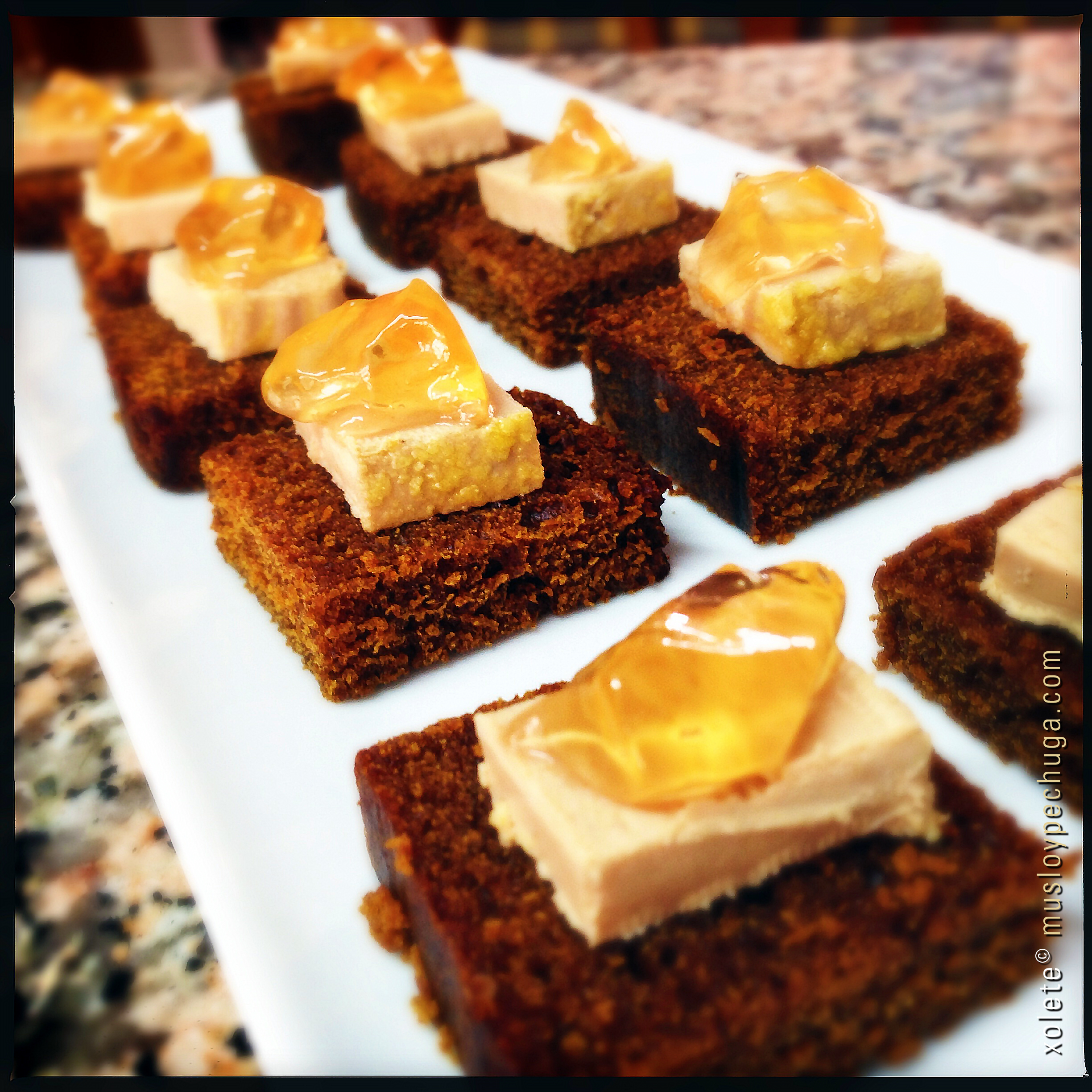 La preparación es tan simple como podamos imaginar. Cortamos el Pan de Especias en rebanadas de 1 centímetro de grosor -aproximadamente- troceamos estas rebanadas en cuadritos de unos 3 centímetros de lado y distribuimos estos cuadraditos en una fuente de presentación. Sobre éstos vamos colocando otros cuadritos, algo más pequeños de Foie -el mejor sistema para cortarlos bien es tener el Foie bien frío y utilizar un cuchillo caliente-.