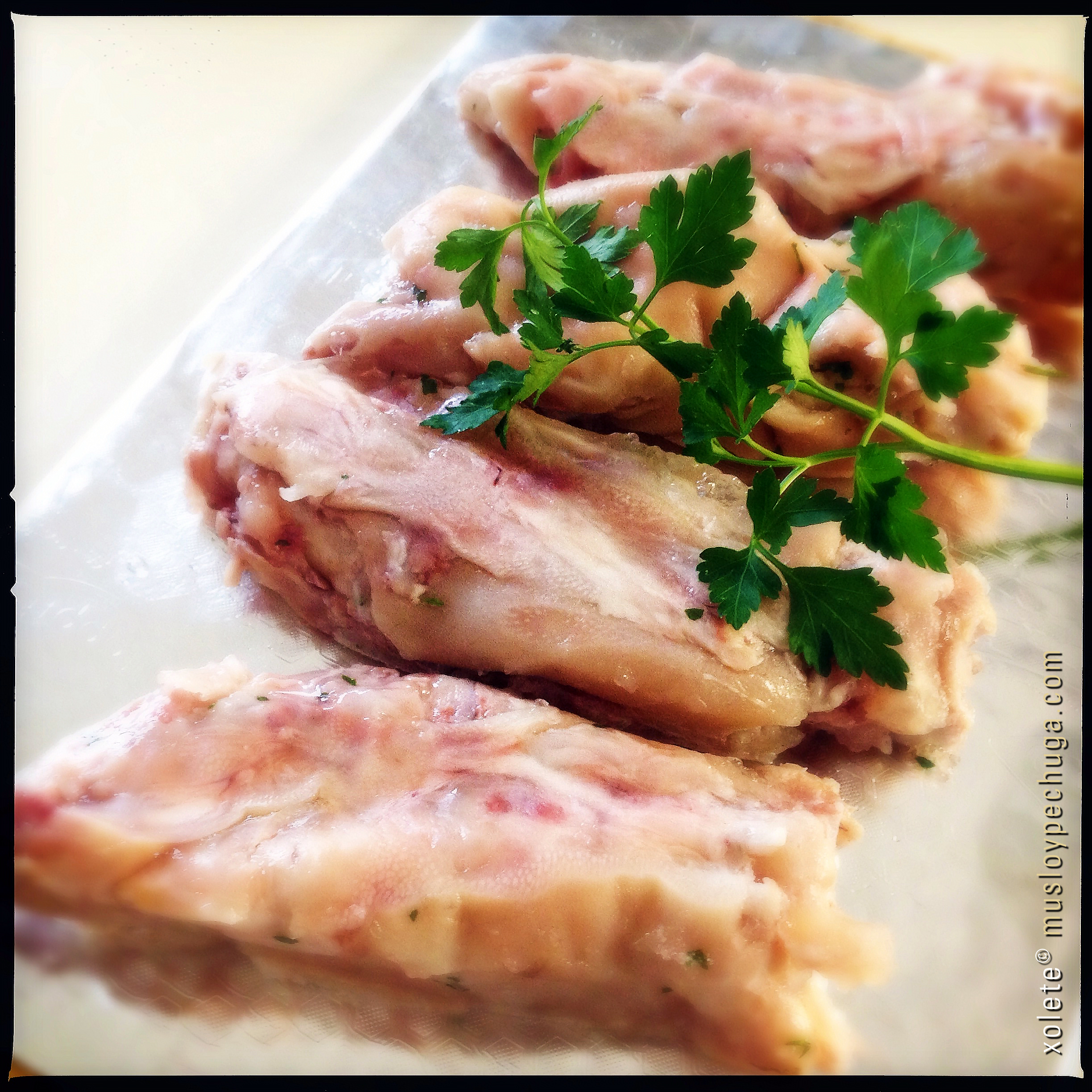 Una sencillísima receta para los amantes de las carnes diferentes, suaves, gelatinosas y con «un poco» de trabajo. Si bien la receta original -tal y como me la han trasmitido- se elabora con salsa de cebolla, en esta ocasión he preferido introducir esta pequeña variación que aporta algo más de dulzor y, sobre todo, color. He de reconocer que me encanta la casquería y otras carnes «menos nobles» -o menos a la moda– en general y, por ello, siempre que me ofrecen unas manos, morros, callos, riñones y demás no puedo por menos que sucumbir a su degustación. Y más en este caso ya que, en una de mis estancias en Paris, me ofrecieron una receta muy parecida a esta bajo el nombre «Les pieds du Ministre» -los pies del Ministro-. Toda una sabrosa declaración de principios!. Vamos con los ingredientes que vamos a necesitar para su preparación: