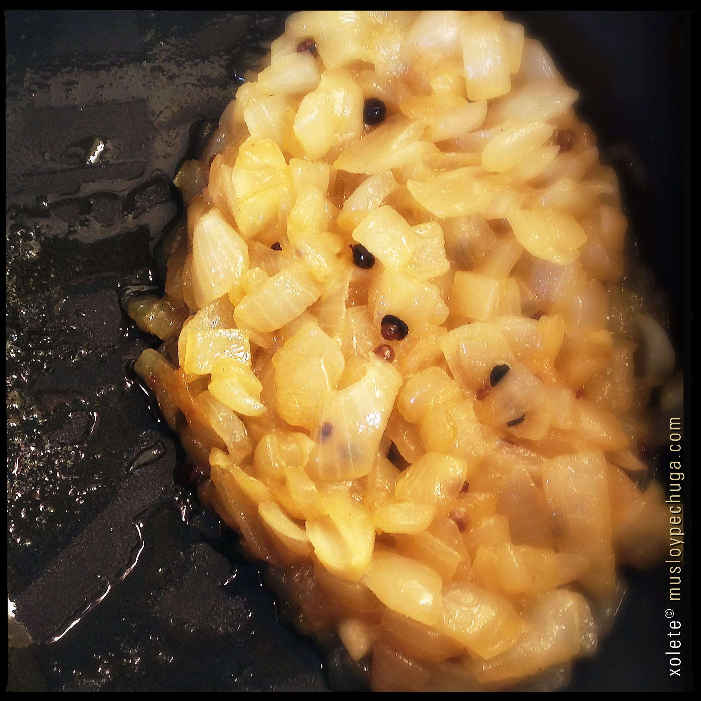 El primer paso consiste en calentar suavemente en una sartén mediana el aceite de Sésamo junto con el de Oliva -o los que vayáis a emplear- . Incorporamos al aceite el diente de ajo picado muy finamente y antes de que tome color añadimos el resto de las especies cuidando en aplastar las bayas de cardamomo a fin de que liberen bien todos sus aromas. Dejamos que las especies de infusionen en el aceite durante un par de minutos y, a continuación, subimos el fuego al máximo e incorporamos la cebolla picada en juliana y el vino blanco. Salamos ligeramente y salteamos durante un minuto a fuego fuerte e, inmediatamente, bajamos la temperatura y dejamos que se evapore el alcohol y la cebolla se poche suavemente durante unos 20 minutos.