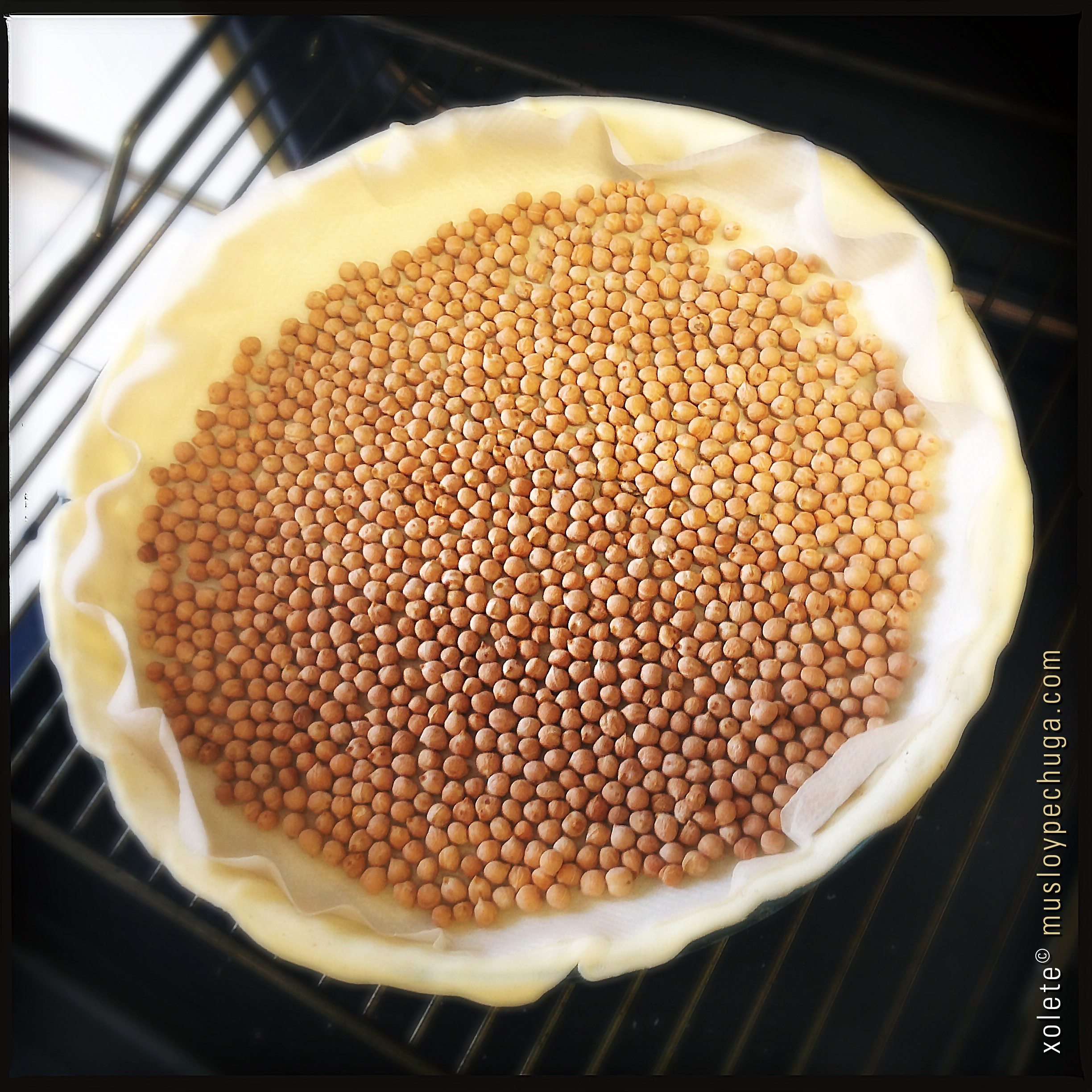 Mientras tanto tomamos la base de hojaldre, la estiramos suavemente sobre una superficie enharinada y forramos con ella el molde presionando bien los ángulos y bordes. Cubrimos con papel sulfurizado y añadimos algo de peso sobre éste a fin de que la base de la masa suba en exceso. Horneamos a unos 180ºC durante unos 10-15 minutos -ver las instrucciones del fabricante para la cocción en blanco-.