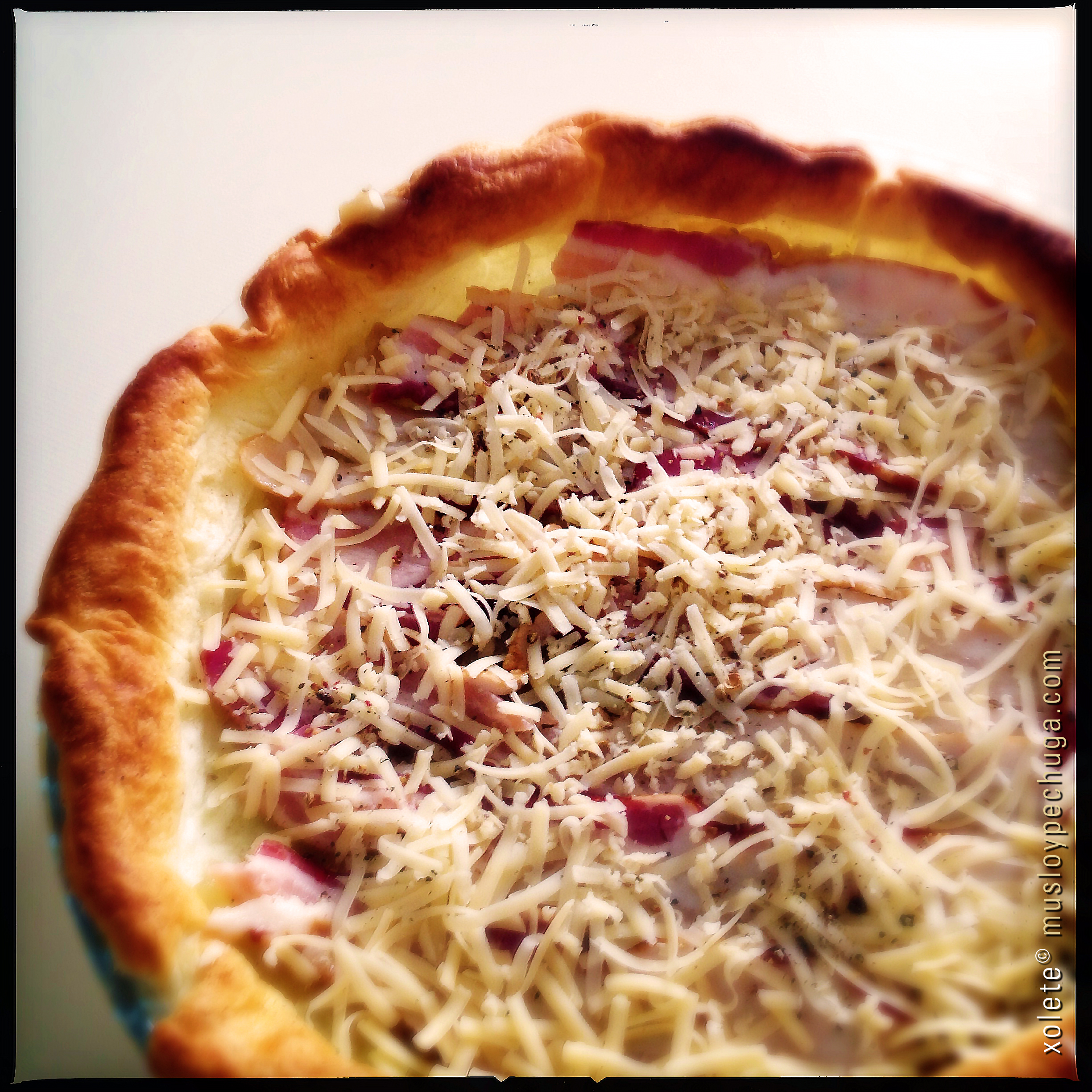 Distribuimos uniformemente la cebolla aromatizada por encima de la masa de hojaldre precocinada y, sobre ella, vamos colocando las lonchas de beicon -o panceta- cubriendo bien el conjunto. Para finalizar espolvoreamos el queso sobre la tartaleta y la terminamos con un poco más de pimienta.