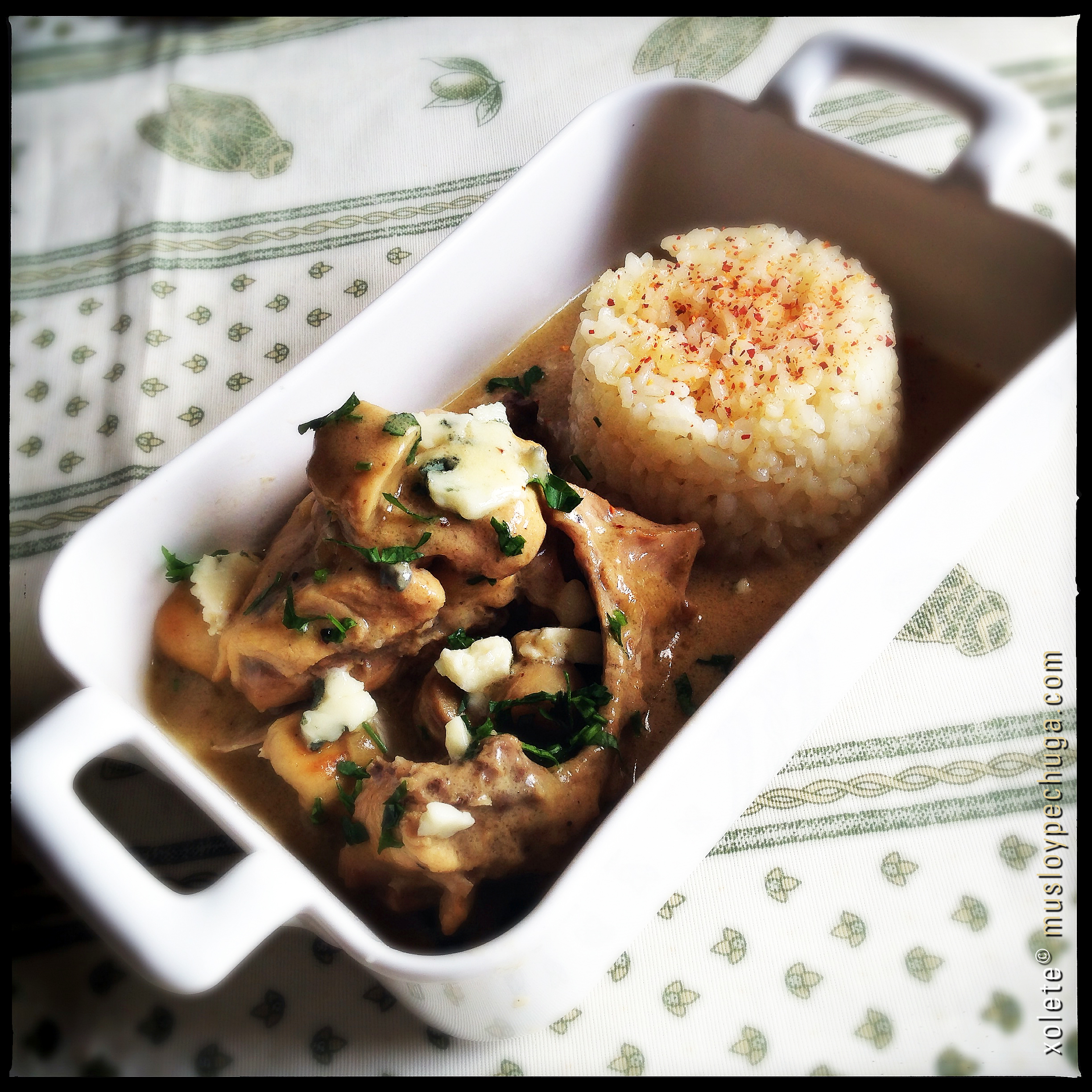 Por último emplatamos –es una buena idea acompañar este guiso con un poco de arroz blanco o unas pasta pequeñas hervidas, tipo Farfallette-. Servimos en cada plato una buena ración, salseamos abundantemente, espolvoreamos unos trocitos de roquefort y un poco de perejil y listo!. Ya solo nos falta acompañar este completo plato con un buen cava o vino blanco, similar al que hayamos utilizado para guisar y disfrutarlo como es debido. Y, como siempre, bon appétit!