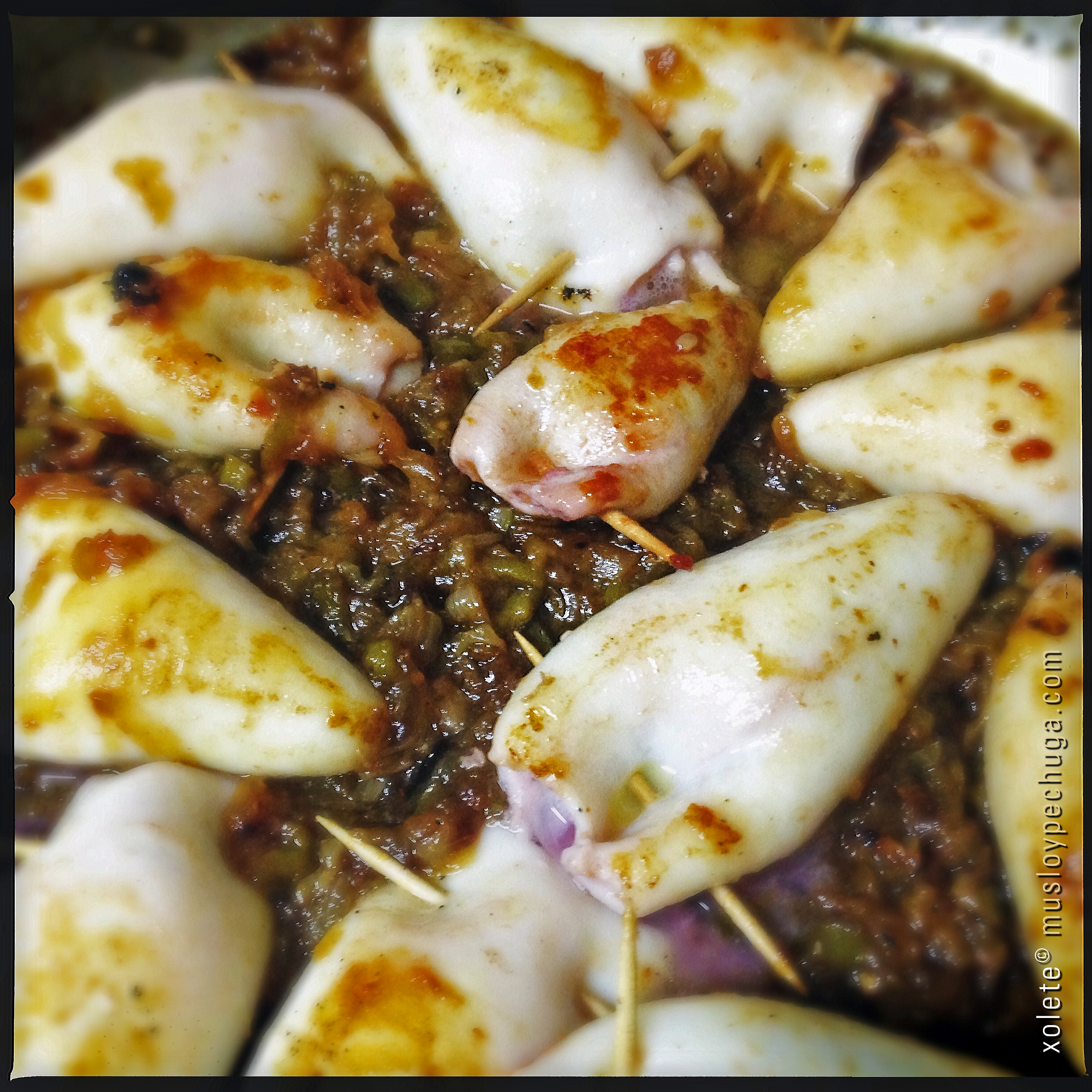 Manos a la obra. Si alguna complicación tiene esta receta, ésta puede ser el proceso previo de preparación de los chipirones. Si estáis en buena armonía con vuestro pescadero nada mejor que pedirle que los limpie con mucho cuidado. En caso contrario el proceso seguir es el siguiente; limpiamos los chipirones por dentro y por fuera con cuidado de no romper la piel, sacamos cuidadosamente –y guardamos para otros usos– las tintas y retiramos el pico –la boca-. Volvemos a limpiar con agua fría los cuerpos, tentáculos y aletas y, finalmente, rellenamos el primero con los otros dos. Cerramos cada chipirón con la ayuda de un palillo y reservamos en frío.