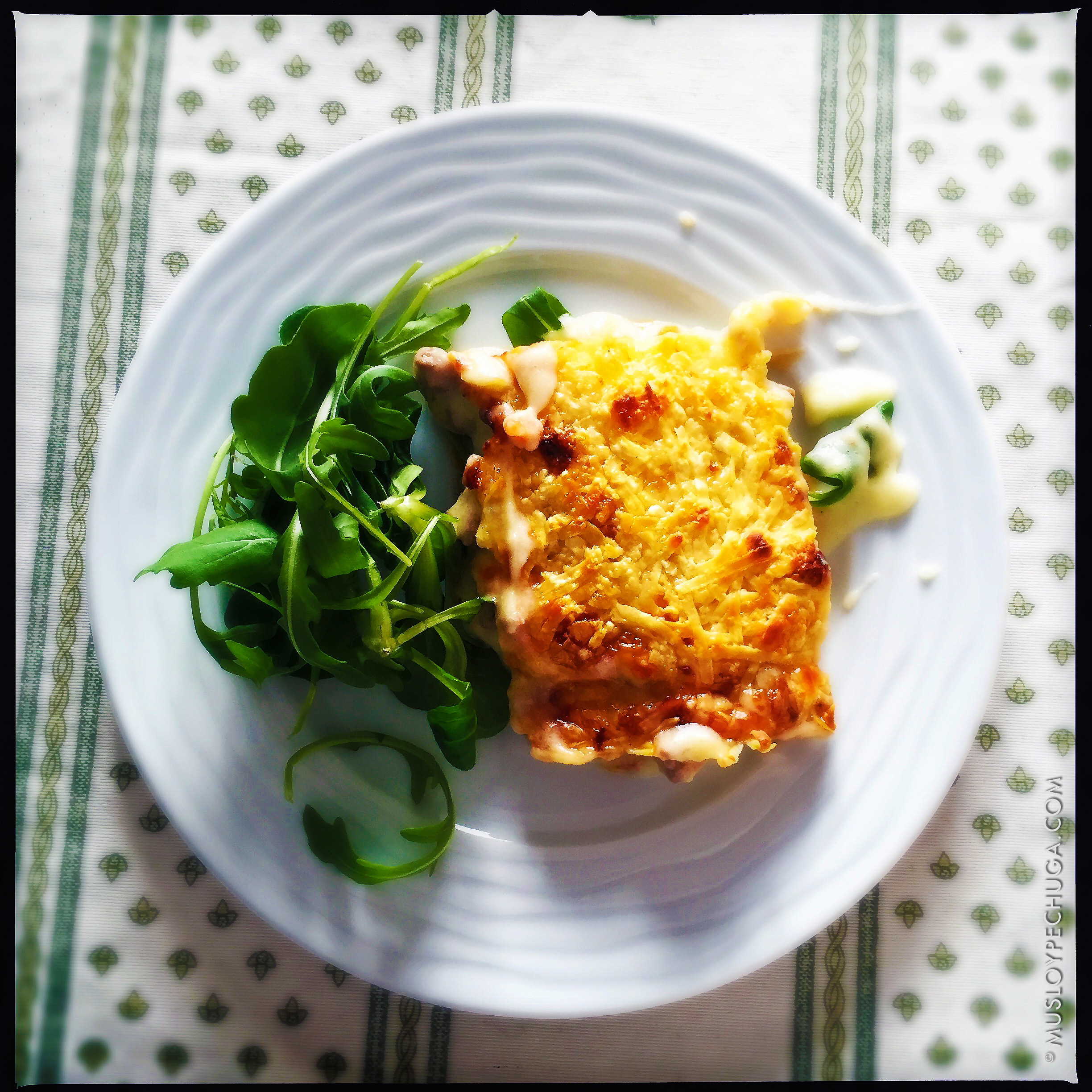 Antes de servir, horneamos la preparación cubierta con papel de aluminio durante una media hora y terminamos gratinando –ya al descubierto– durante unos cinco minutos más, hasta que la preparación adquiera un bonito color brillante y tostado. El resultado ha de ser un sabroso y reconfortante plato que combina la untuosidad del puré con la textura y sabor firme de la carne y verduras y una crujiente capa de queso gratinado. Me gusta acompañar esta consistente receta con un poco de ensalada suavemente aliñada de berros y recula que aligeran y matizan el conjunto. Y, una vez más, esto es todo; espero que ustedes lo disfruten y, como siempre… Bon appétit!