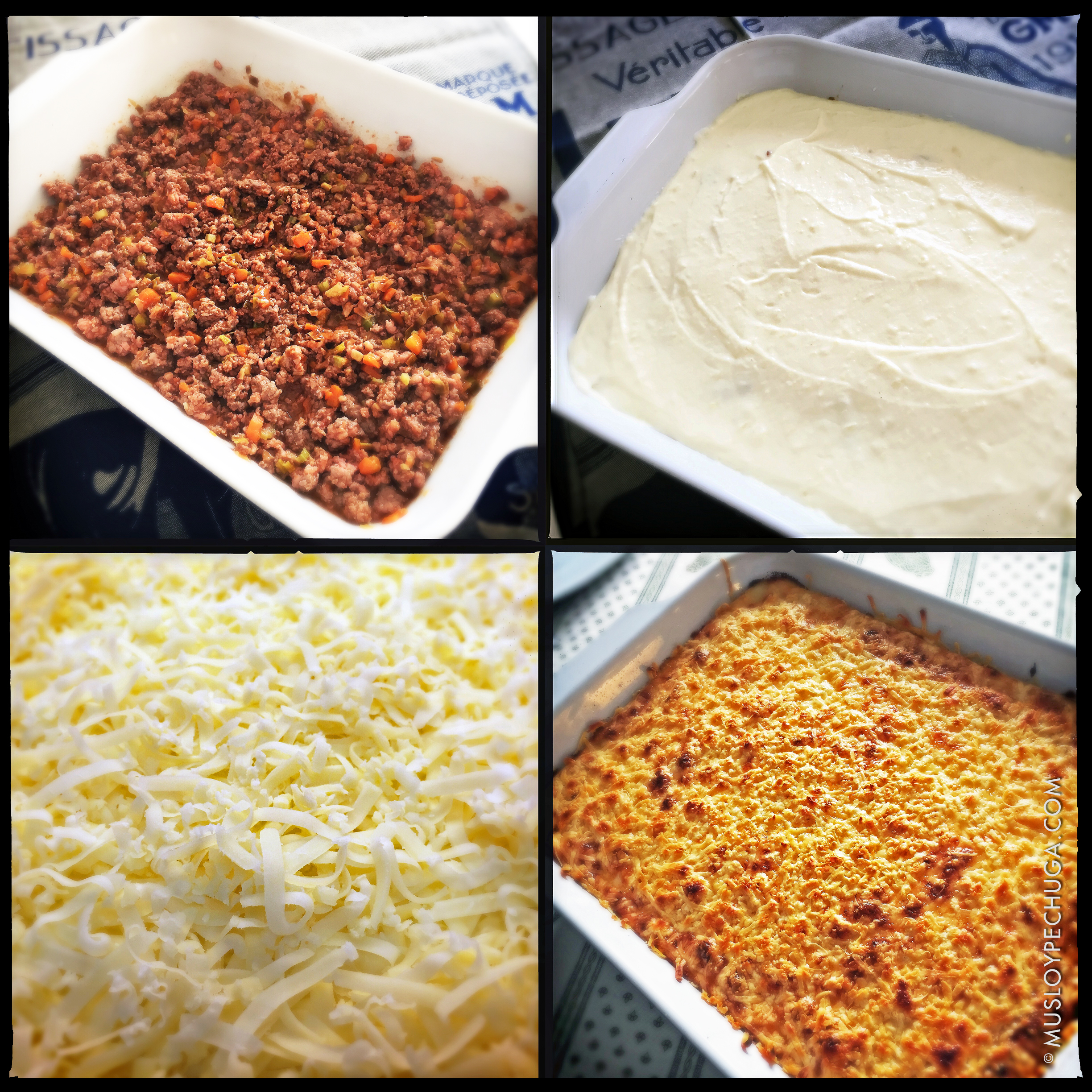 Y así, con todas las partes preparadas, llegamos al momento del montaje. Tomamos una fuente amplia de horno y en ella colocamos la carne con las verdura en una primera capa que cubra todo el fondo. Sobre ésta extendemos uniformemente el puré de patatas con la ayuda de una espátula y, finalmente espolvoreamos el queso rallado por encima.