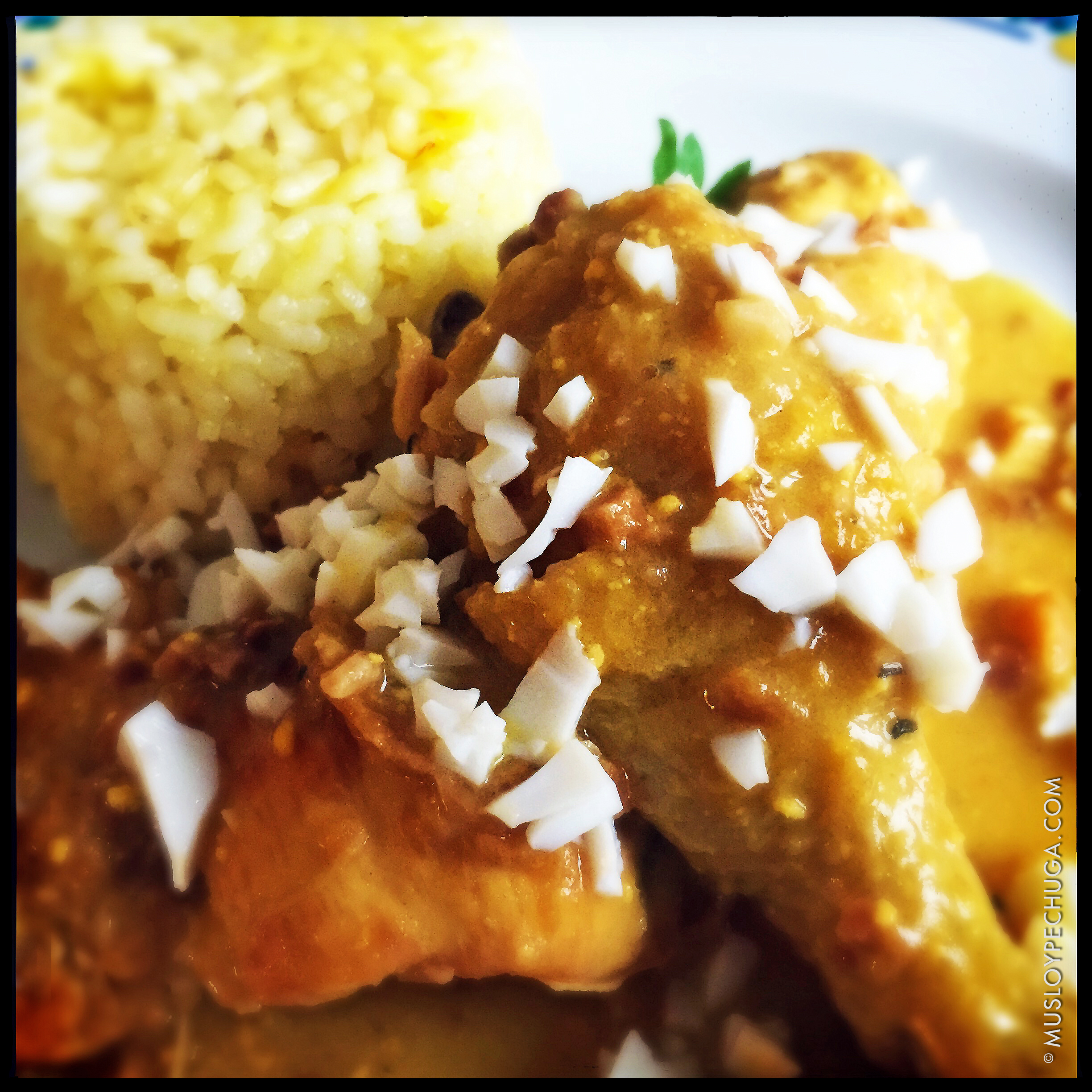 Acabamos. Como todos los guisos es preferible tenerlo preparado de un día para otro a fin de que los ingredientes se estabilice y los aromas y sabores se integren. Calentamos –si fuera necesario– suavemente el guiso, espolvoreamos las claras cocidas y troceadas y lo acompañamos con un arroz aromatizado –al azafrán, en este caso– o unas patatas fritas. El resultado ha de ser un muy aromático y meloso conjunto que contrasta con el crujir de las almendras y la profundidad de sabores de su salsa. Un deleite adecuado para estos días pre –o post– navideños, reconfortante, tradicional, sencillo de elaborar y, sobre todo, del gusto de todo el mundo. Espero que ustedes lo disfruten y, como siempre… bon appétit!