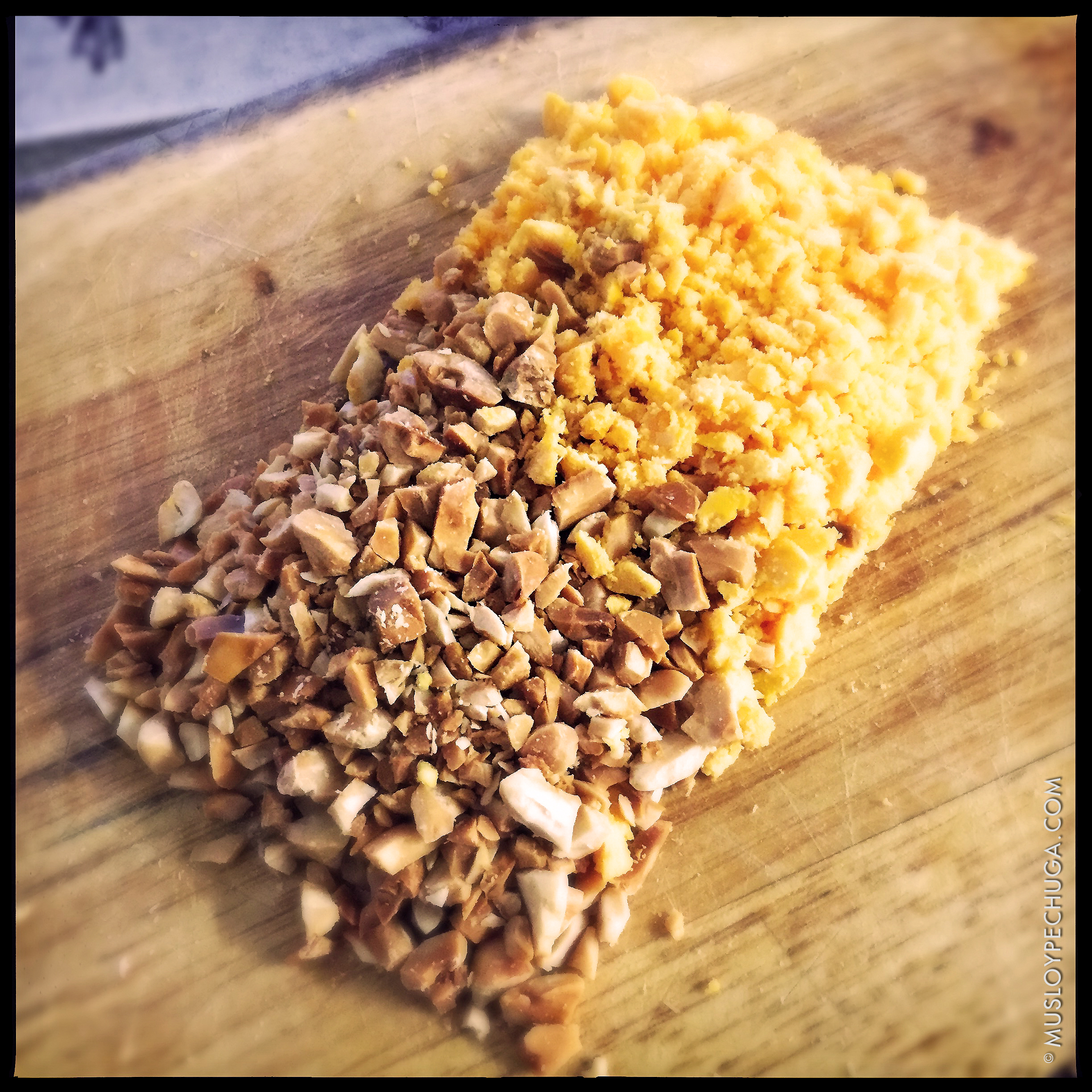 Mientras tanto, freímos las almendras en una sartén con un par de gotas de aceite cuidando que no tomen demasiado color. Una vez fritas, las pasamos por un papel absorbente, las dejamos enfriar y las troceamos –no demasiado finas ni uniformes para que aporten, además de su sabor, una agradable y contrastada textura crocante-. Al mismo tiempo, cocemos los tres huevos durante unos ocho minutos hasta que resulten duros –cuajados-. Enfriamos, pelamos y separamos las yemas de las clara, reservando éstas últimas y troceando las yemas. Reservamos.