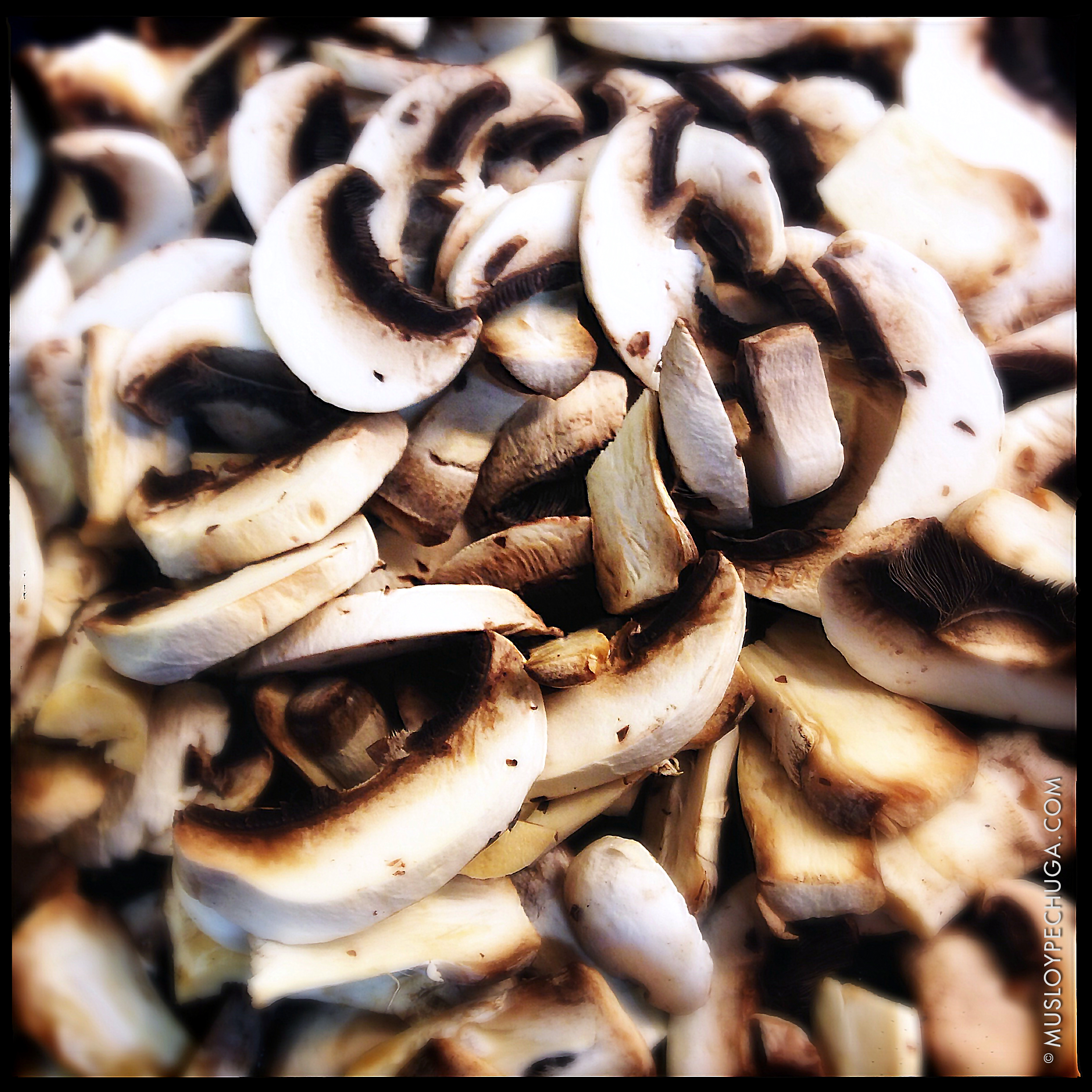En esta misma sartén pochamos las chalotas picadas en juliana fina durante unos minutos sin dejar que lleguen a tomar color. Añadimos el cognac –o brandy– y dejamos que evapore el alcohol. Mientras tanto pelamos y cortamos los champiñones en láminas no demasiado finas y los incorporamos a la base junto con el líquido que recuperamos del plato en el que reposa la carne salteada. Salpimentamos suavemente y salteamos durante unos minutos hasta que los champiñones queden levemente crocantes.