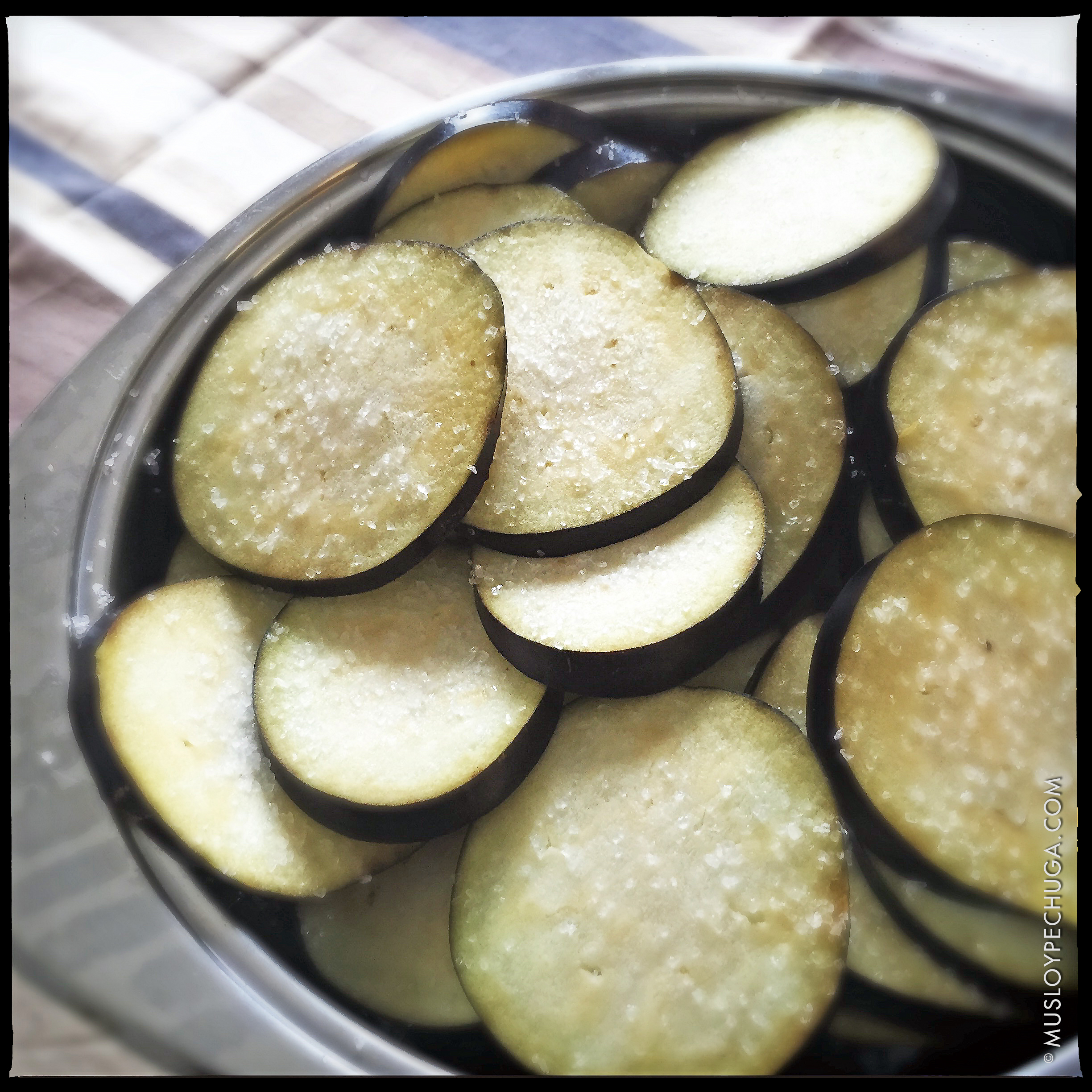 Comenzaremos por extraer el amargor de las berenjenas. Para ellos las lavamos, cortamos en rodajas finas –de unos 3 milímetros-, salamos abundantemente y dejamos escurrir durante al menos media hora. Transcurrido el tiempo –cuanto más, menos amargor– las retiramos sobre papel absorbente y dejamos escurrir.