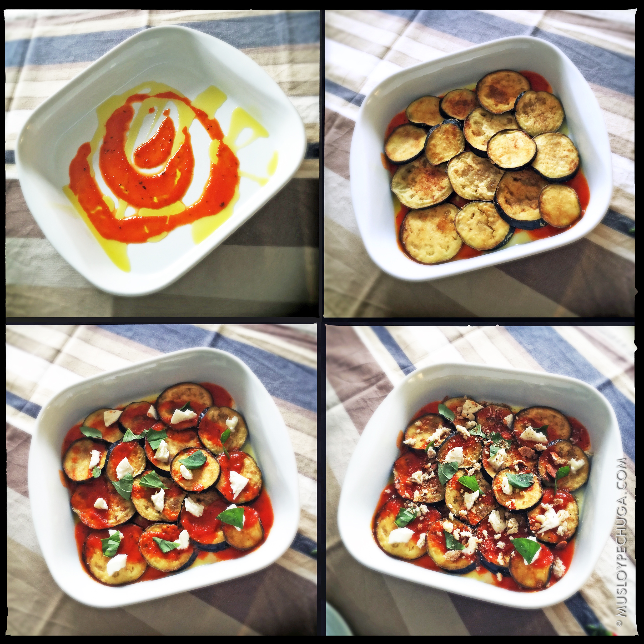 Una vez escurrida las berenjenas y aliñado el tomate procedemos a montar la Parmesana. Pintamos el fondo de una fuente de horno con un poco de aceite de oliva y un par de cucharadas de tomate. Sobre él disponemos una primera capa de berenjenas y volvemos a pintar con un poco más de tomate. Añadimos unos trocitos de mozzarella, unas hojas de albahaca y, por último, unos trozos de picos rotos y aplastados . Volvemos a repetir la operación; más berenjena frita, tomate, mozzarella y picos hasta terminar con los ingredientes. Sobre la capa superior podemos espolvorear un poco de Parmesano antes de gratinar –o una dosis extra de crujientes picos rotos-.