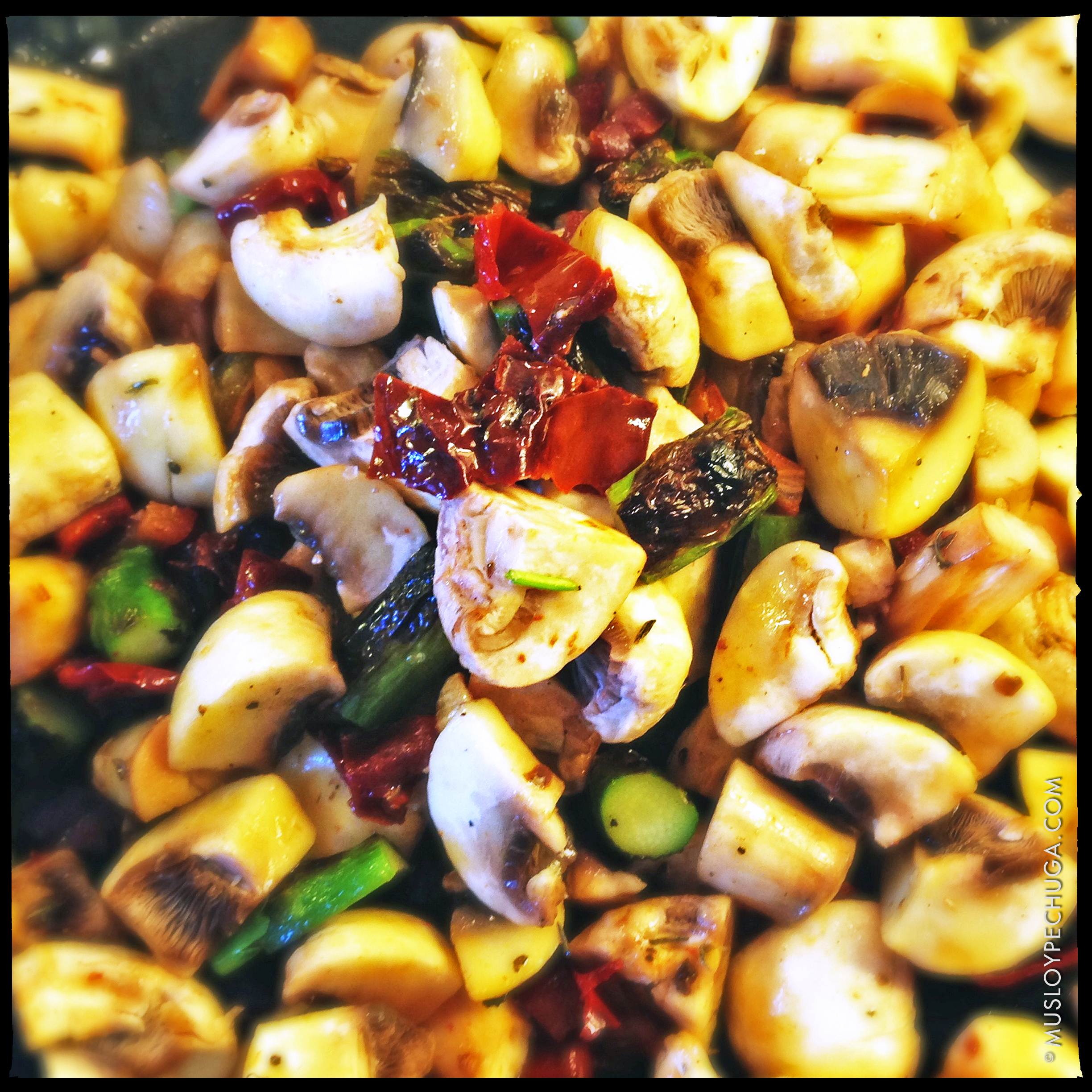Una vez tomen color –y continuando a fuego medio– incorporamos los champiñones –o setas de temporada– limpios y troceados, unas ramitas de perejil troceado, el pimiento seco –de Espelette o Ñora– troceado, los espárragos y alcachofas también troceados en un tamaño similar al de los champiñones. Removemos, salpimentamos –teniendo cuidado con la sal del jamón– y dejamos hacer hasta que los champiñones hayan liberado todo su líquido y éste se haya evaporado.