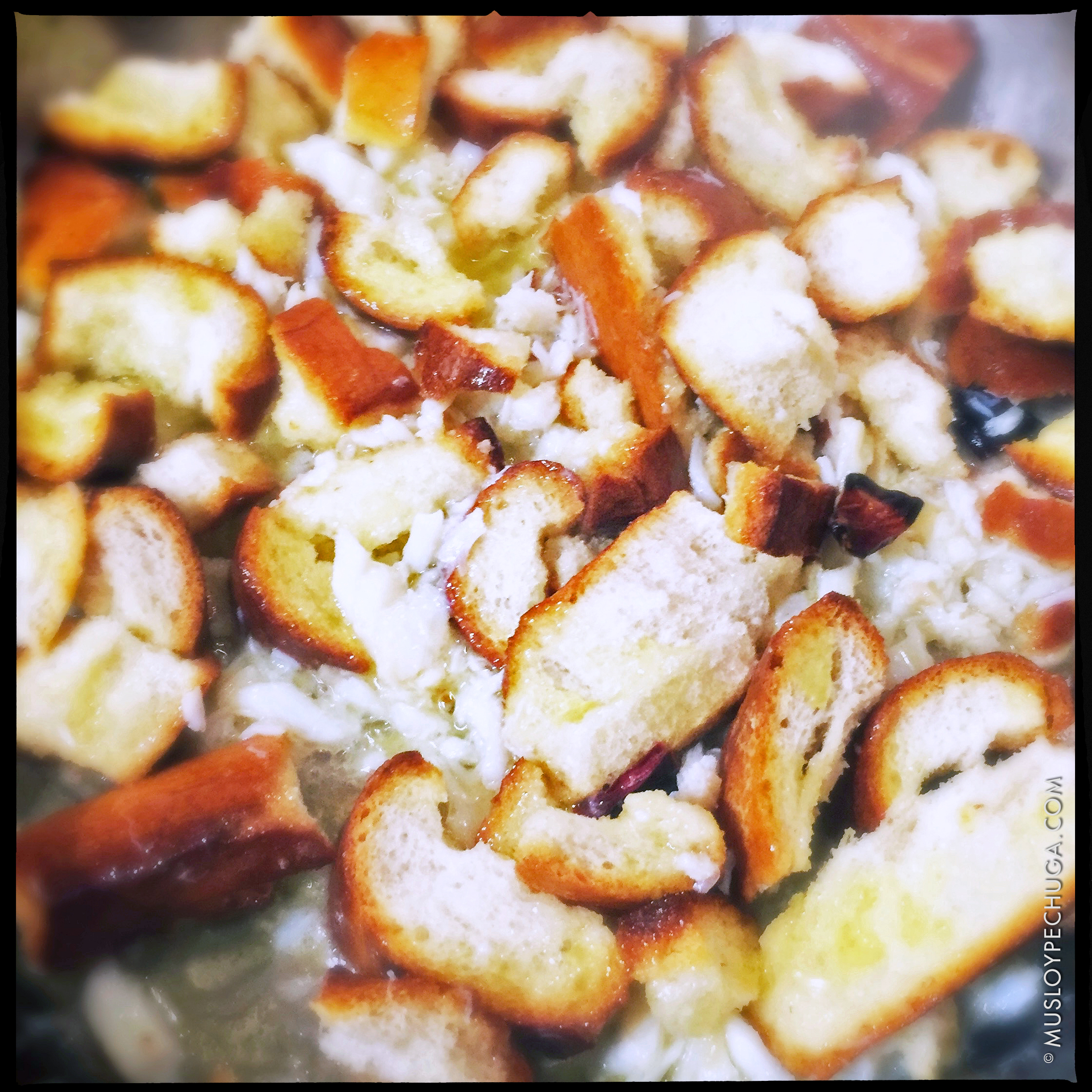 Cortamos el pan en rebanadas finas y las salteamos junto con el bacalao hasta que absorban todos los líquidos y comiencen a tomar color. Incorporamos la carne de los pimientos choriceros, el tomate frito y el caldo de pescado y dejamos cocer muy suavemente durante una hora –aproximadamente– removiendo de vez en cuando. Es importante ir deshaciendo –con la ayuda de una cuchara de madera– las rebanadas de pan a fin de obtener una textura densa. Finalmente podemos incorporar algo de agua –o más caldo– a fin de obtener la densidad que deseemos –personalmente prefiero que resulte bastante consistente-.