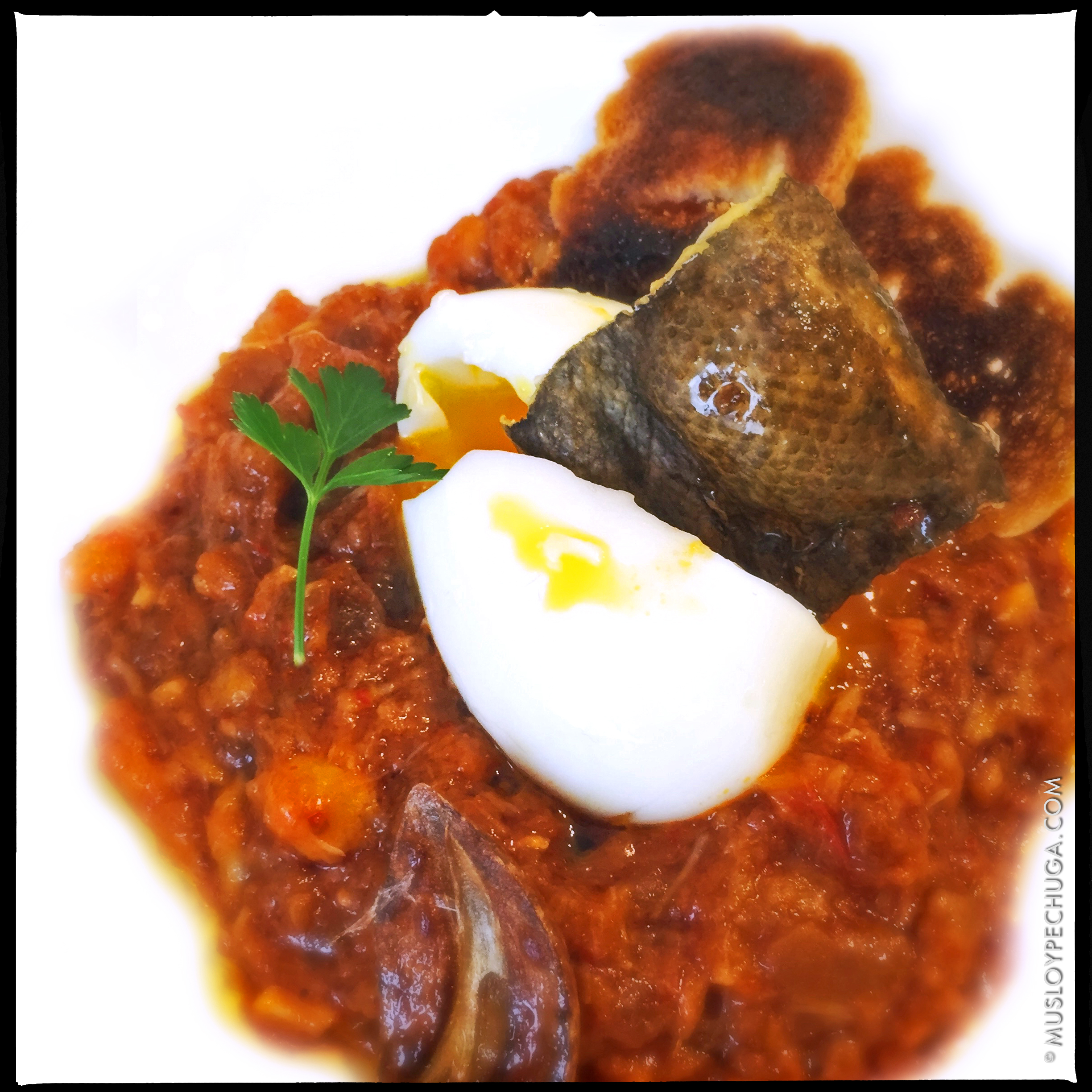 Vamos con el emplatado; depositamos un par de cucharadas de zurrukutuna en un bol de mesa o plato hondo, colocamos un huevo sobre ella y decoramos con una rebanada de pan tostado, un crujiente de bacalao, una hojita de perejil y un finísimo hilo de aceite de oliva virgen extra. Ya solo falta tener a mano una buena botella de vino y ganas de disfrutar de esta tradicional y exquisita receta. Así que, con su permiso, me retiro a dar buena cuenta de mi ración. Que ustedes la disfruten y… bon appétit!