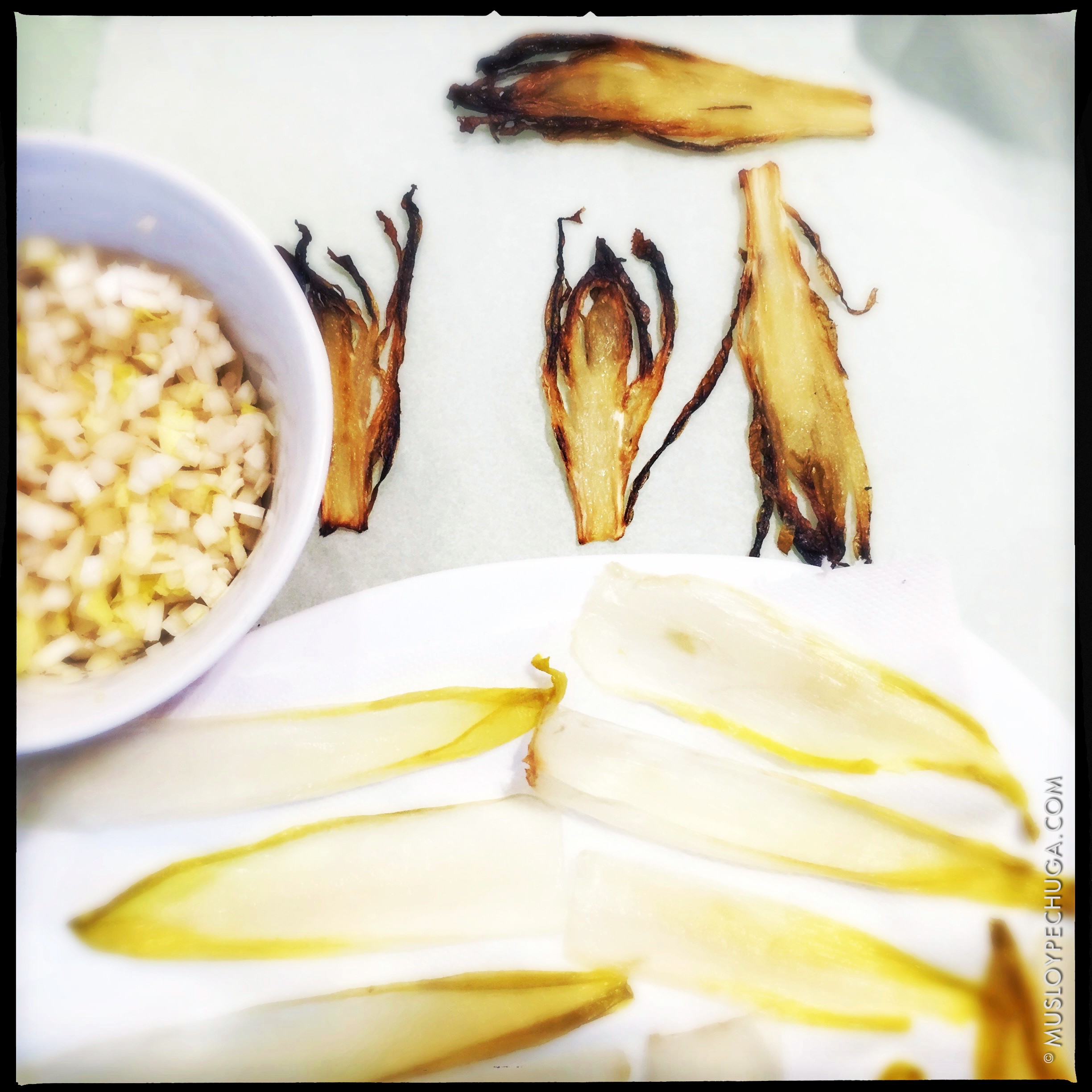 Para ello comencé asociando nuestras endivias con la col china, de aspecto similar pero características muy diferentes, un experimento –en forma de wantán- que resultó interesante para su –futura– evolución. Segundo intento, más próximo geográficamente, en forma de una Quiché que reinterpreta, en caliente, la ensalada de endivias con Roquefort y nueces; interesante también pero –tal vez– un tanto obvio. Vuelta a empezar, pero esta vez, la tercera es la definitiva.