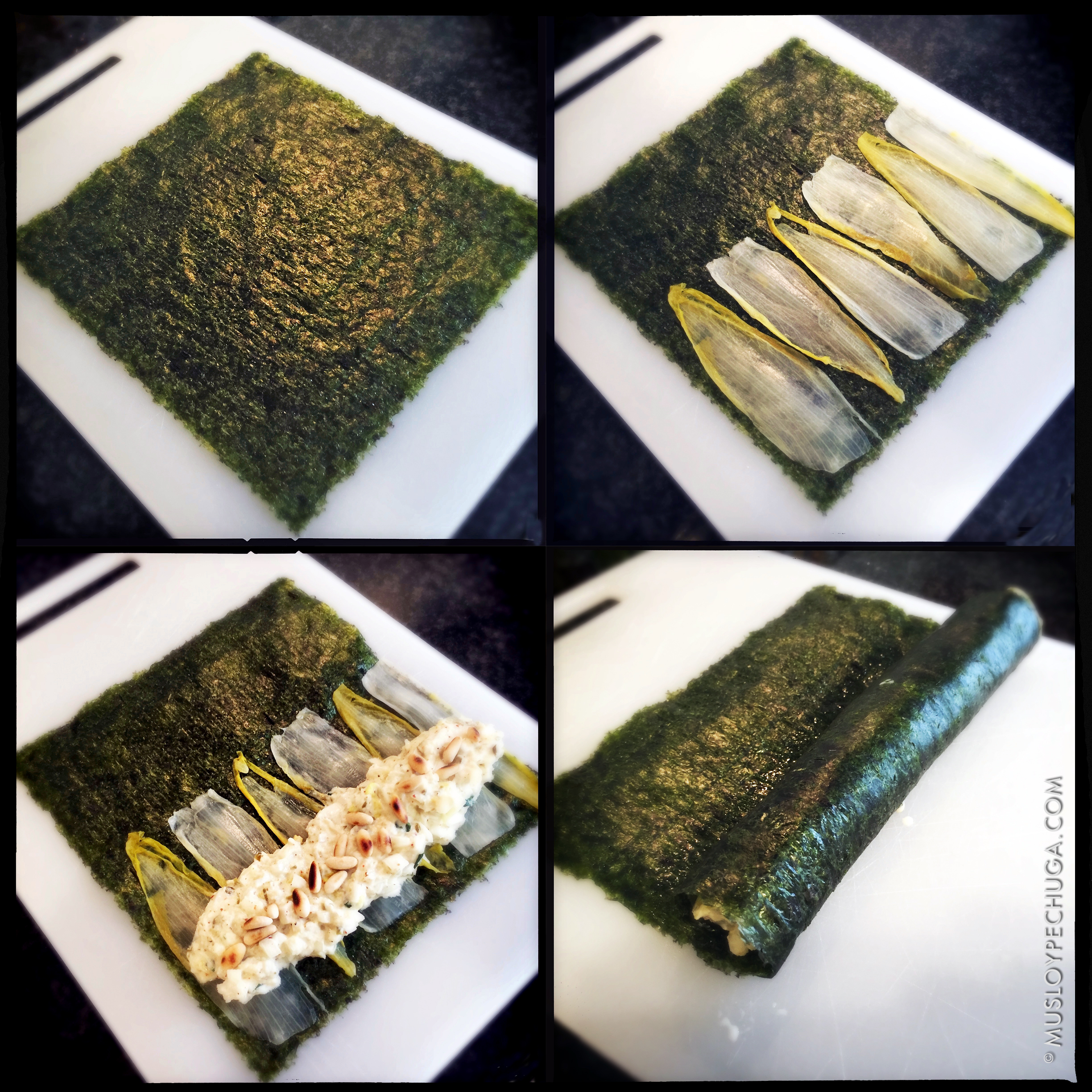 Lo primero que haremos es disponer una hoja de alga nori –cara rugosa hacia arriba– sobre una superficie plana de trabajo. Sobre ésta colocaremos unas hojas de endivia cocida hasta completar el ancho. Con la ayuda de una cuchara depositamos sobre éstas una hilera de tartar que remataremos con unos piñones salteados y salados.