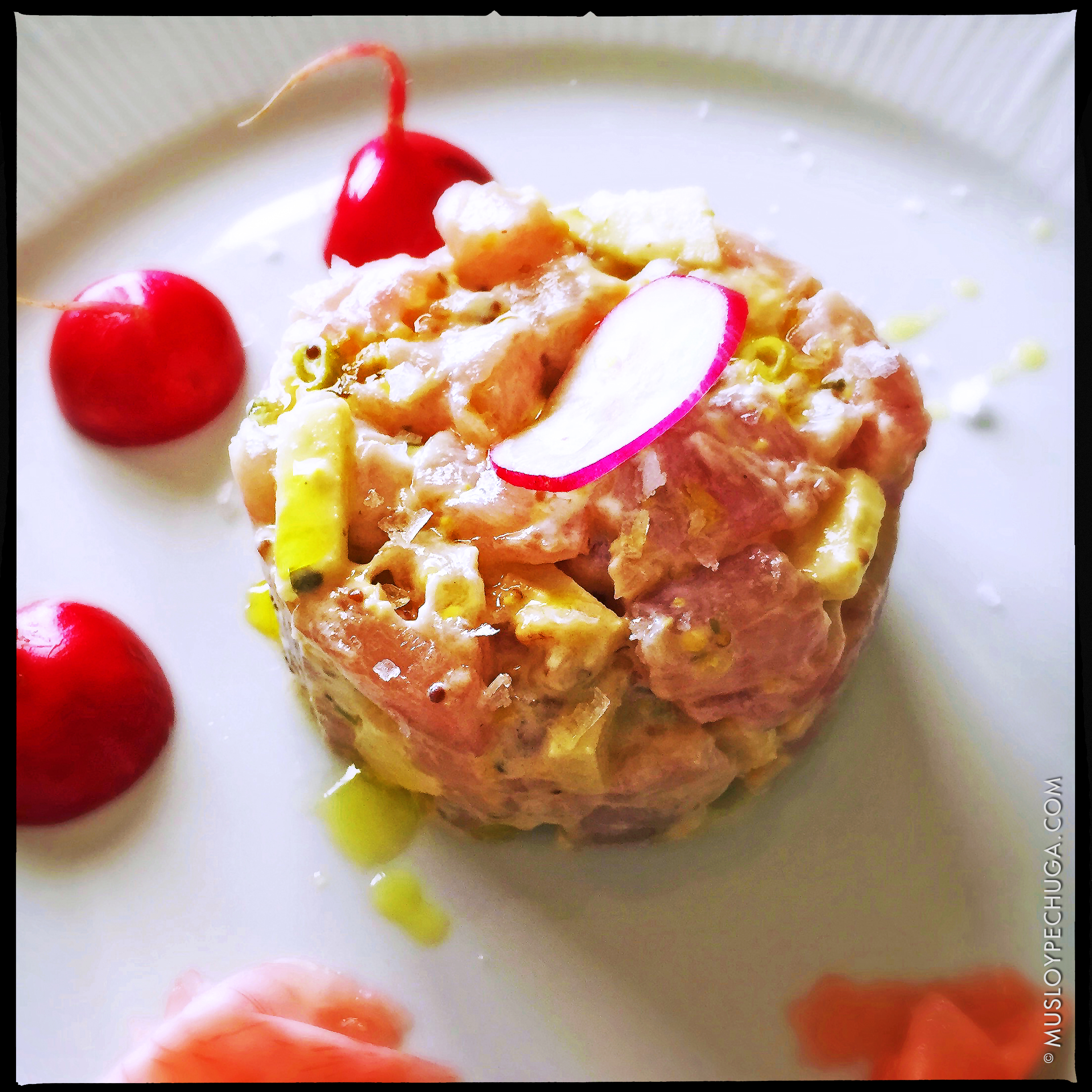 En el momento de servir, tomamos un bol amplio y depositamos en su fondo los trocitos de bonito. Incorporamos parte del aliño y mezclamos con mucho cuidado de no deshacer el pescado. Comprobamos la textura resultante –ha de ser sólida y levemente cremosa– y rectificamos añadiendo algo más salsa si fuera necesario. Dejamos reposar un par de minutos a fin de que los ácidos actúen sobre el pescado.