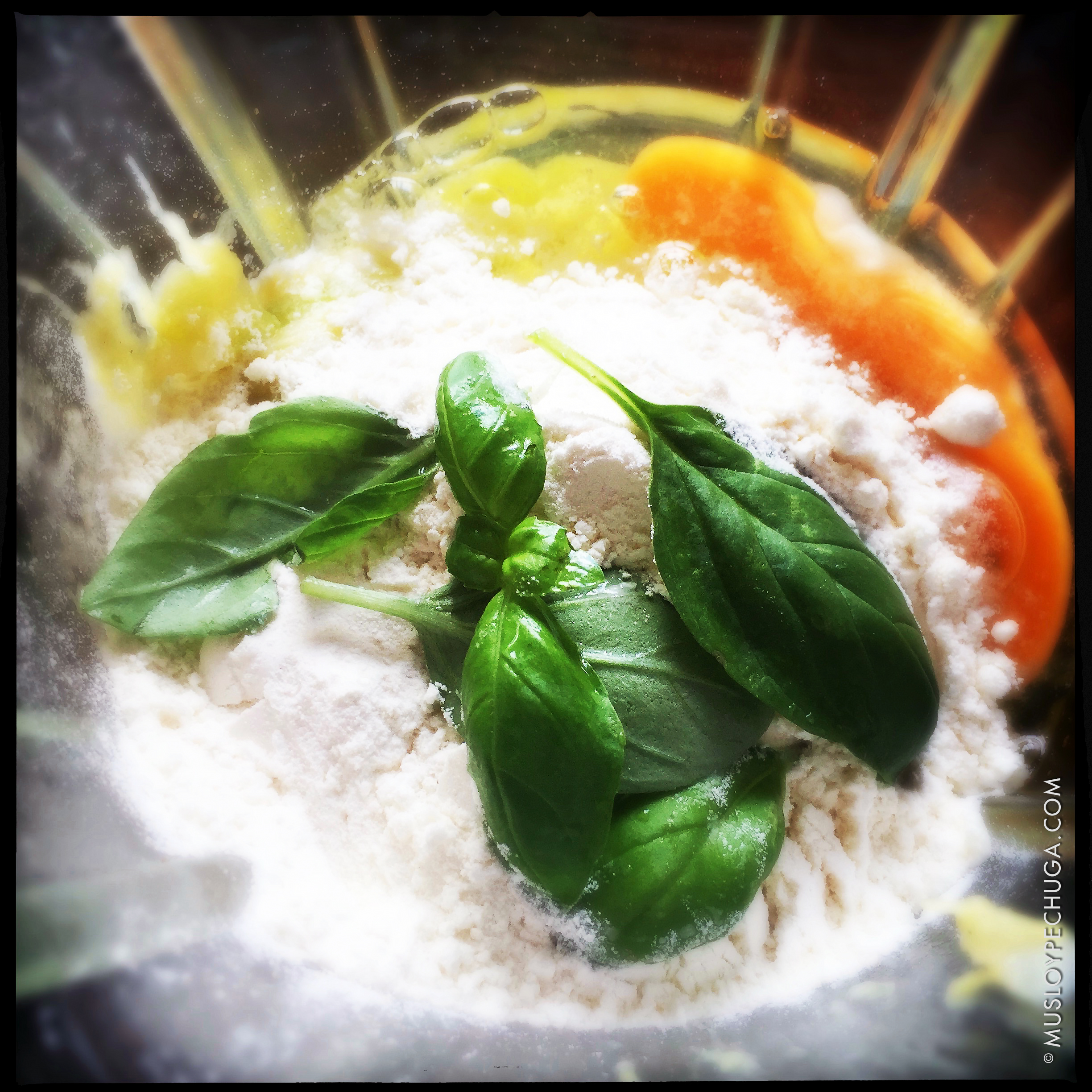 Una vez los ingredientes hayan perdido todo el líquido y el calabacín comience a deshacerse pasamos la mezcla a un colador y dejamos escurrir. Finalmente pasamos esta mezcla al baso de la batidora –o robot– e incorporamos un huevo, la harina y unas hojas de albahaca. Mezclamos hasta obtener una masa lisa y homogénea. Comprobamos el punto de sal y reservamos.