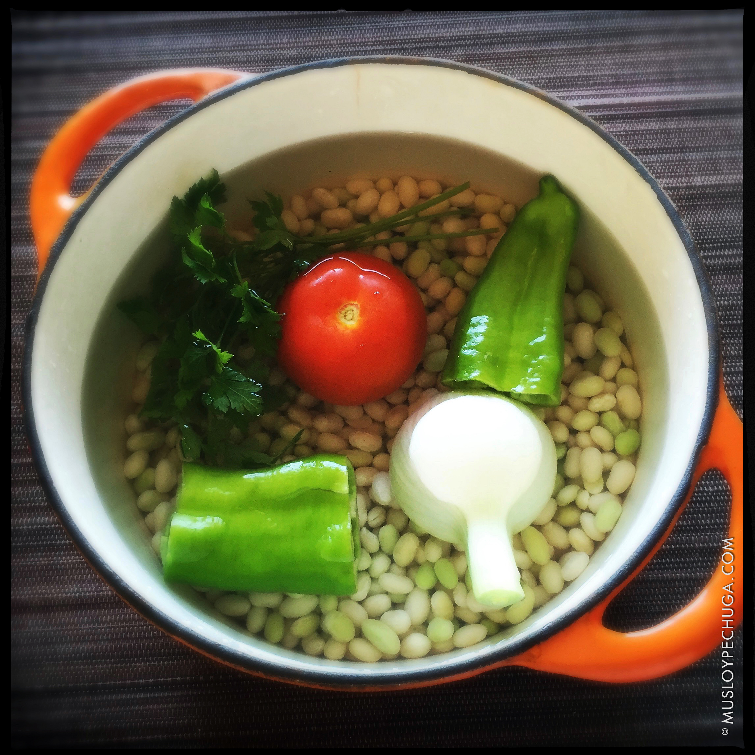 Comenzaremos por la cocción de las pochas que ha de ser lenta y delicada. Tomamos una olla y cubrimos las pochas con agua fría –unos tres o cuatro dedos por encima de ellas– e incorporamos el tomate lavado y entero, el pimiento limpio, partido y sin pepitas, la cebolla entera a la que habremos retirado un par de capas superficiales y unas ramitas de perejil. Acercamos la olla al fuego medio-bajo y dejamos que tome temperatura muy lentamente. Una vez aparezcan las primeras burbujas del hervor bajamos la temperatura y dejamos cocer lentamente durante unos 30 minutos, hasta que las pochas están blandas pero sin llegar a deshacerse.