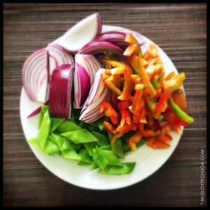 Pollo, gambas y caldo en marcha, pasemos a las setas y verduras. Lavamos, pelamos y troceamos la cebolla en gajos amplios –cada verdura ha de ser un mini bocado-, lavamos y troceamos del mismo modo el pimiento, los tirabeques y las setas. Reservamos.