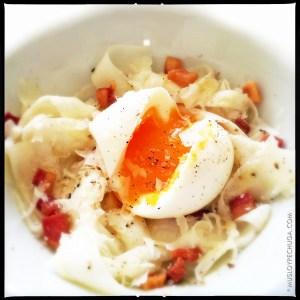 Mi primera propuesta consiste simple y llanamente en revertir ese gran –y demasiadas veces maltratado– clásico de la cocina italiana que es la Carbonara –no dejéis de leer o repasar mi entrada al respecto; La Carbonara; errores, mitos y leyendas y algún truco– sustituyendo la pasta por espárragos forma de tallarines e introduciendo una variante en la utilización del huevo, en esta ocasión sin cuajar completamente. Y, en realidad, esto es –casi– todo, así que vamos con la lista de ingredientes: