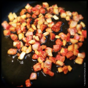 Al mismo tiempo cortamos la panceta ibérica en pequeños cubitos, los pasamos a una sartén en seco –sin grasa añadida– y dejamos que se vayan dorando y desengrasando haya que resulten dorados y crujientes. Los retiramos a un papel absorbente para extraer el exceso de grasa y los reservamos hasta el momento del emplatado.