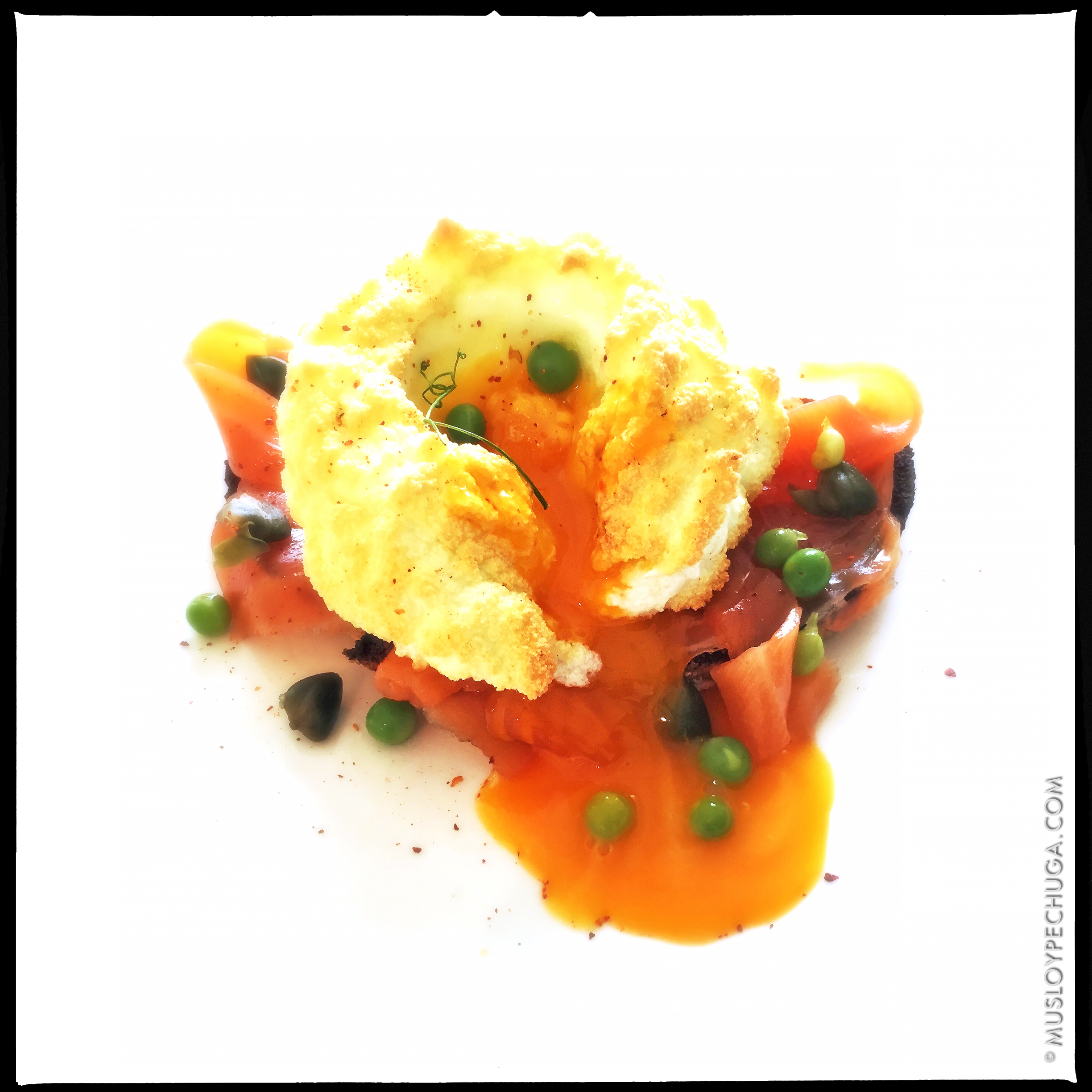 La receta, sencilla a más no poder está lista para ser degustada a modo de plato único e informal. La combinación de la cremosidad de la yema de huevo hecha al punto con la propia del salmón, el crujido intenso y profundo del pan y la volatilidad etérea del merengue aromatizado de guisantes son sus cartas de presentación. Estos últimos aportan, además, su carácter a medio camino entre el dulzor y lo herbáceo, con una textura levemente crujiente. Completa el conjunto la salinidad levemente ácida de las alcaparras, la densidad melosa y marina del salmón y el toque levemente picante del Piment d’Espelette.