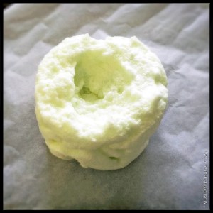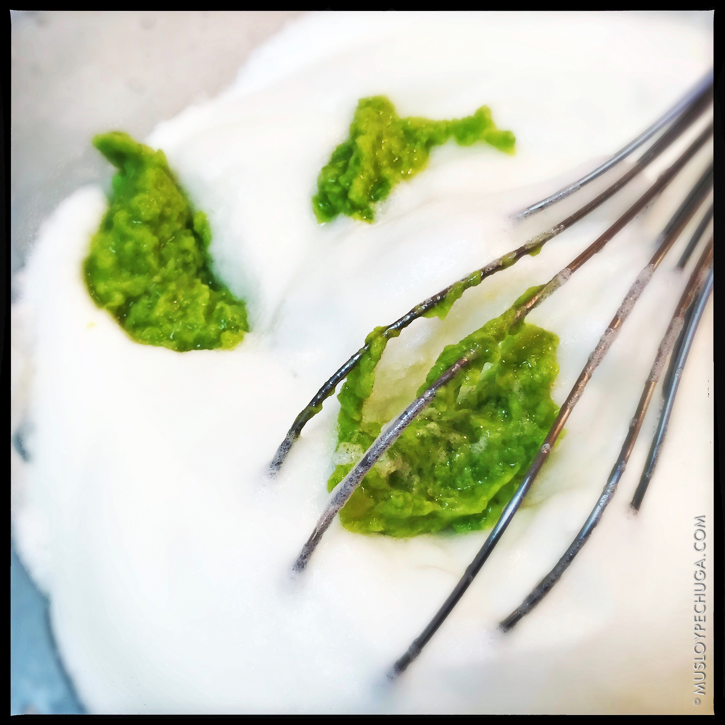 Como ya he comentado en la introducción mi intención era que este merengue salado tuviera un bonito tono verdoso, pero tras un par de pruebas –desastrosas, todo hay que decirlo– he optado por incorporar tan solo una pequeña cantidad de guisantes que, si bien no alcanzan a colorear completamente la masa, sí que le aportan una cierta textura y color. Incorporar más cantidad pone en peligro la estabilidad del merengue y, por lo tanto, el resultado de la receta. La solución podría pasar por secar completamente la pasta en el horno para que la humedad no afecte a las claras montadas –seguiremos investigando-.