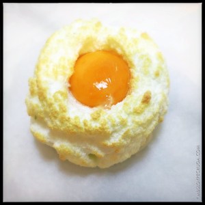 Sigamos: precalentamos el horno a 230ºC y vamos depositando el merengue en cuatro porciones sobre recortes de papel sulfurizado. Con la ayuda de unos aros de emplatar le damos forma circular y terminamos vaciando, con una cuchara, un pequeño hueco en la zona central de cada una de las porciones –donde más adelante depositaremos las yema-. Retiramos los aros –el merengue habrá de mantenerse perfectamente estable– y una vez que el horno esté a la temperatura adecuada los introducimos –cada uno con su papel– durante tres minutos.