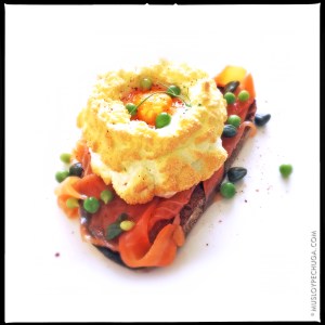Tostamos las rebanadas de pan –solo por una cara para que resulten más suaves– y pintamos la cara crujiente con un poco de mostaza fuerte de Dijon –opcional-. Sobre ella colocamos una loncha de salmón y, a continuación, depositamos uno de los huevos nube. Añadimos un puñadito de guisantes cocidos y escurridos y unas alcaparras –al gusto, personalmente me encantan-. Terminamos con un toque de Pimiento de Espelette molido.