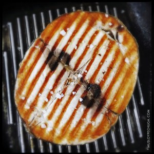 Mientras tanto calentamos a máxima potencia una plancha o sartén ligeramente engrasada. Salamos ligeramente el pescado y, una vez la plancha alcance la máxima temperatura, marcamos la rodaja de bonito durante un minuto por cada uno de sus lados. La cocción del pescado finalizará en el medio ácido que es el escabeche y su vinagre.
