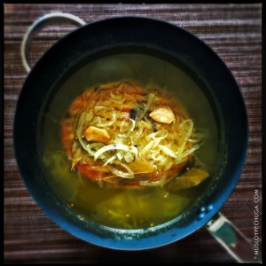 Comenzaremos por confitar muy lentamente y en una cazuela amplia el aceite junto con los dientes de ajo –que habremos partido por la mitad y retirado el germen-, las hojas de laurel, la mezcla de pimientas y las semillas de cortando –o cilantro-. Cuando los ajos comiencen a tomar un ligero tono avellana tostada incorporamos la cebolla cortada en pluma –o media luna– y las cucharaditas de sal y azúcar. Mezclamos y mantenemos el confitado suave durante unos 10 ó 15 minutos.