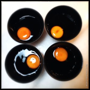 Lo primero que hemos de hacer es separar las claras –que podemos congelar para otras recetas– de las yemas y, a continuación, sumergimos cada una de ellas en una mezcla preparada con la salsa de soja y el jengibre en polvo. Como es posible que las yemas tienda a juntarse –y afear el resultado-, lo más adecuado es utilizar un pequeño recipiente para cada una de ellas. Además, las yemas tenderán a flotar por lo que es conveniente remover cuidadosamente el recipiente y, una vez el exterior se solidifique, voltearlas cada cierto tiempo con la ayuda de una cuchara.
