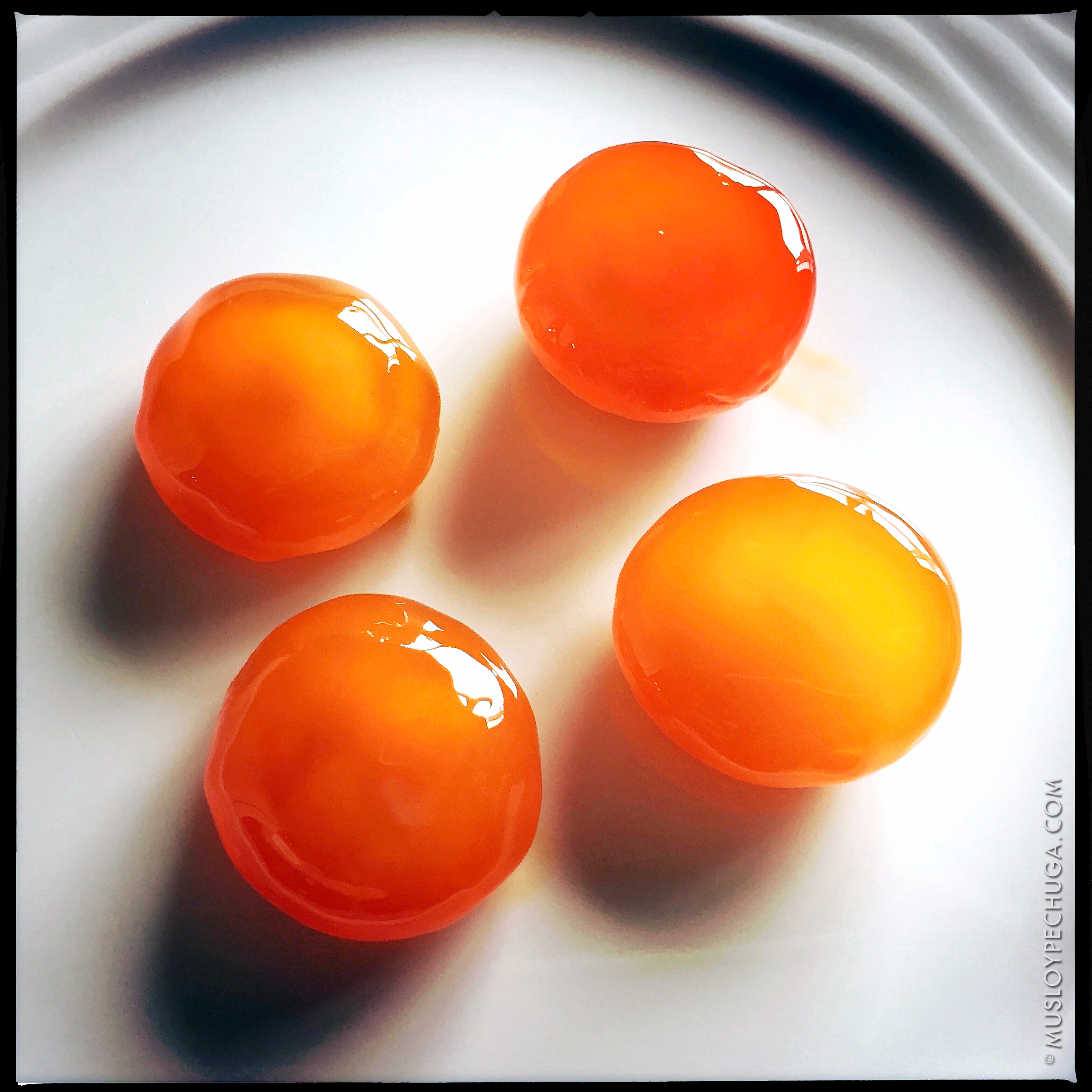 El punto de curado –el tiempo en definitiva– dependerá de cómo queramos las yemas. A partir de una hora ya se forma una película flexible en el exterior que va avanzando hacia interior a medida que pasa el tiempo. Como en este caso buscaba unas yemas completamente cuajadas pero levemente untuosas –es decir no sólidas– las dejé macerar en frío durante 48 horas. Tal vez con 36 hubiera sido suficiente, pero no quise arriesgarme a que una parte de la yema continuara líquida. Seguiremos afinando.