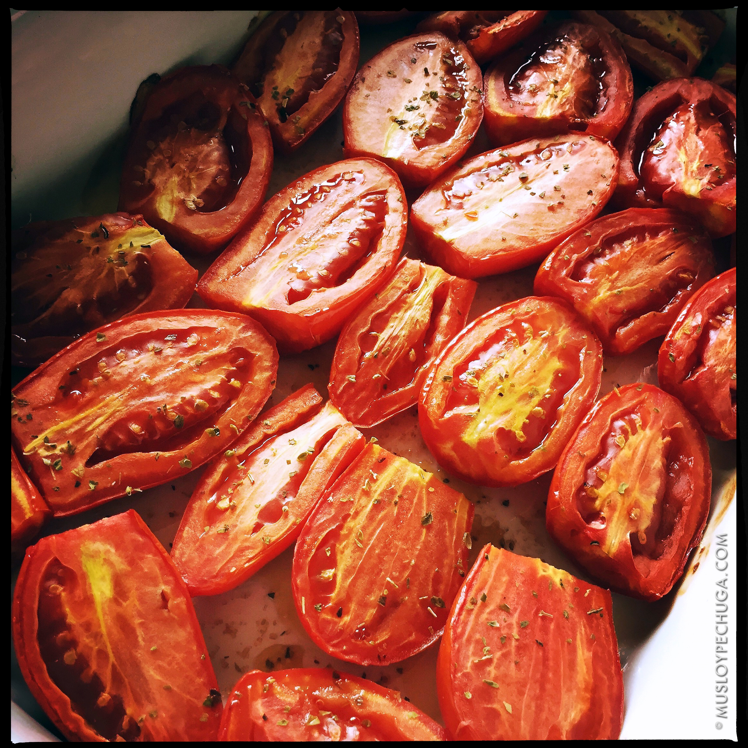 Como decía al inicio de esta entrada, vamos a asar suavemente el tomate a fin de obtener un aroma más intenso, aromático y profundo. Para ello comenzaremos por precalentar el horno a unos 200ºC y lavar cuidadosamente los tomates. Secamos, cortamos cada uno de ellos por la mitad longitudinalmente y los depositamos en una fuente de horno cuyo fondo habremos pintado muy ligeramente con un hilo de aceite de oliva.