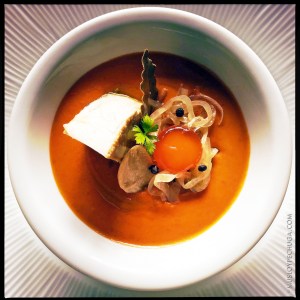 Os propongo, a continuación, dar un toque de intensidad y profundidad al salmorejo asando previamente los tomates y alejándolo así de su consideración –demasiado encorsetada, a mi entender– de simple y refrescante entrada. La cremosidad emulsionada de la elaboración da para mucho más. Solo es cuestión de buscar el punto de ruptura con la idea fija de crema fría y, por supuesto, de buscarle unos buenos compañeros de viaje –o, en este caso, plato-.